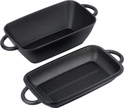 De duurzame constructie is bestand tegen hoge temperaturen in de oven, op het fornuis en op gloeiende kolen. Beide delen hebben veilige zijgrepen voor eenvoudige hantering en kunnen ook apart worden gebruikt – zo vergroot je de kookmogelijkheden van soepen en brood bakken tot steaks met een perfect grillpatroon.