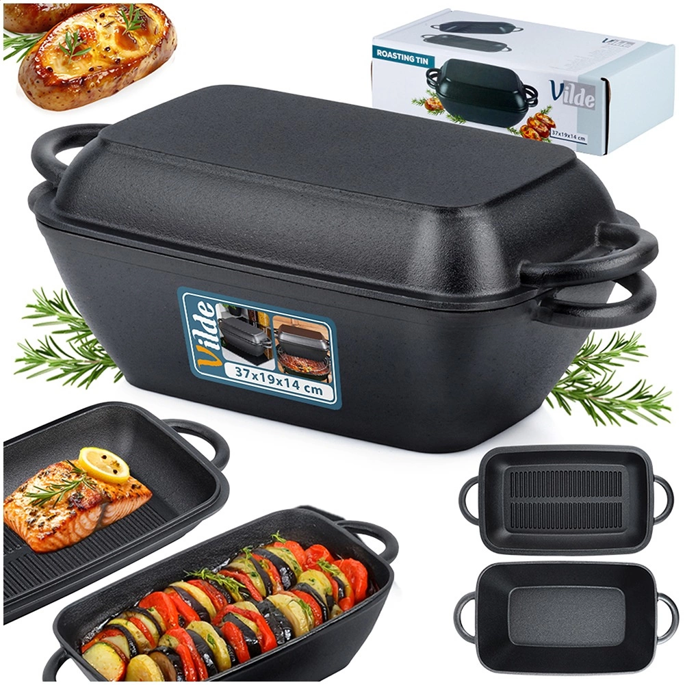 Universele gietijzeren braadpan 2-in-1 met deksel, dat tevens dient als aparte grillpan. Robuust gietijzer verdeelt de warmte uitstekend en houdt deze lang vast, ideaal voor braden, stoven en gratineren van vlees, vis en groenten. Geschikt voor alle soorten kookplaten, inclusief inductie, voor in de oven en boven open vuur.