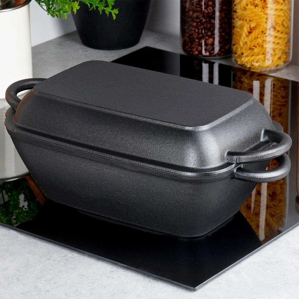 Deze praktische gietijzeren braadpan biedt twee pannen in één: een diepe pan met een inhoud van 3,5 l en een deksel met een intern grillribbelprofiel, te gebruiken als pan van 1,5 l. Dankzij de gelijkmatige warmteverdeling en uitstekende accumulatie is hij ideaal voor sappig braden, langzaam stoven en knapperig grillen.