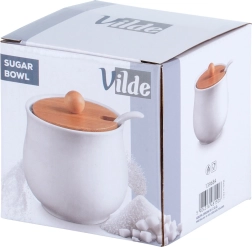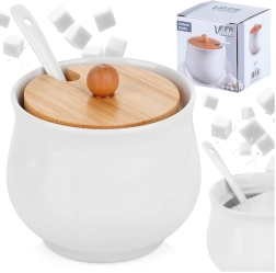 Elegante witte suikerpot met bamboe deksel en keramische lepel, ideaal voor dagelijks serveren. Biedt een capaciteit van 250 ml, een afneembaar deksel met uitsparing voor de lepel en een duurzame keramische uitvoering die de inhoud langer vers en schoon houdt.