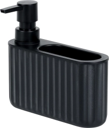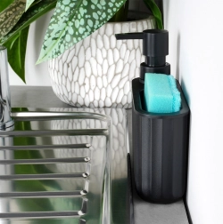 Deze dispenser combineert opslag voor een spons en dosering van afwasmiddel in één compact geheel. De matzwarte afwerking met geribbelde structuur past perfect bij moderne, klassieke en industriële interieurs en houdt de omgeving van de gootsteen schoon en georganiseerd.