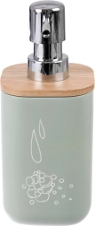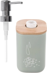 Stijlvolle dispenser voor vloeibare zeep of afwasmiddel met een inhoud van 350 ml, ideaal voor op de wastafel of bij de gootsteen. Het lichaam van hoogwaardige synthetische steen oogt als keramiek en wordt aangevuld met een bamboe deksel en een glanzend pompje voor comfortabel doseren.