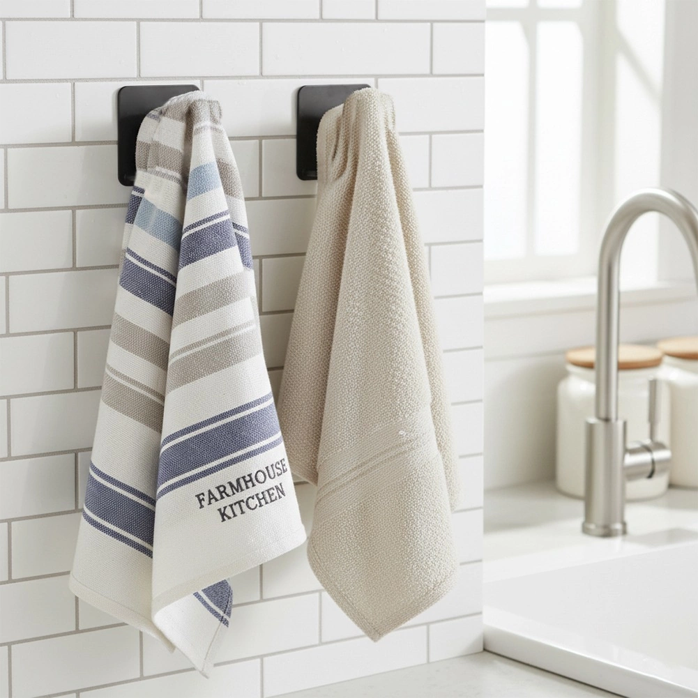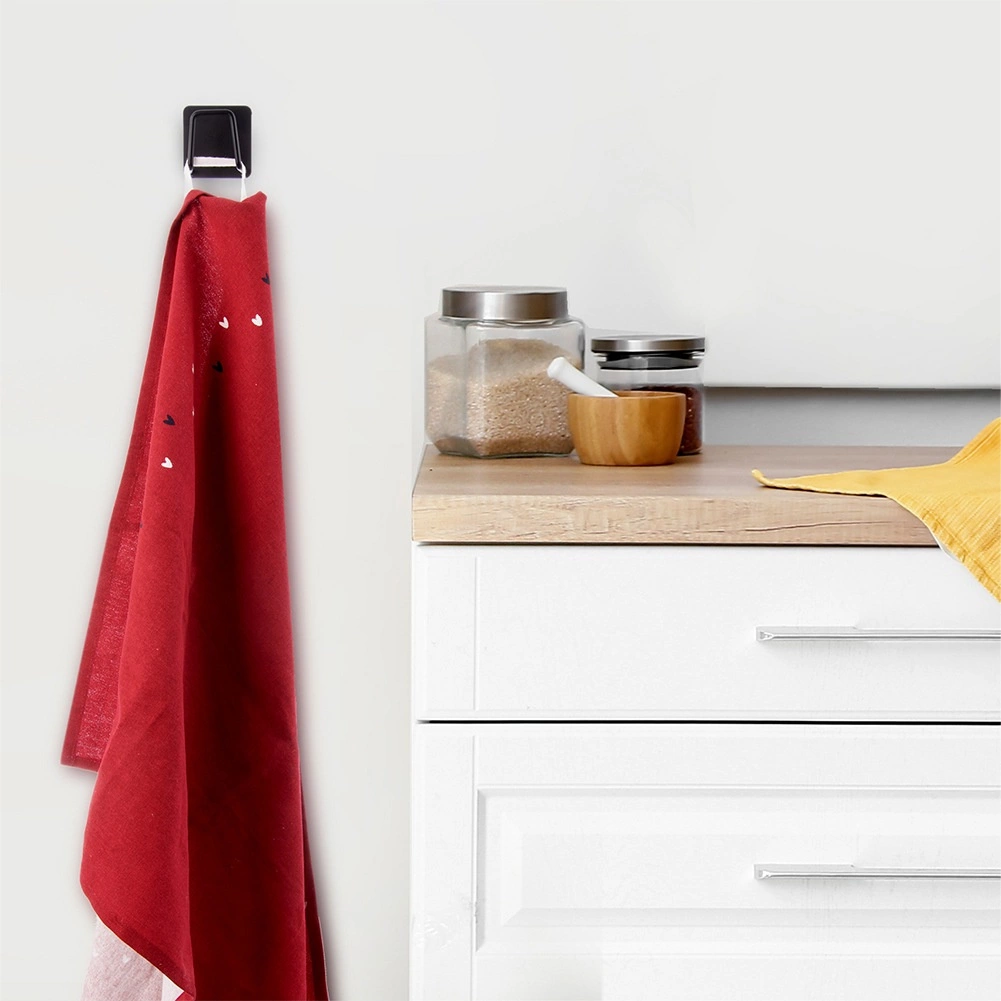 Universele zelfklevende haakjes in een elegante zwarte kleur voor keuken en badkamer. Dankzij de 3M-tape houden ze stevig zonder boren, zijn ze eenvoudig te installeren en perfect voor handdoeken, theedoeken, washandjes en kleding. De compacte afmetingen en het moderne design passen in elk interieur.