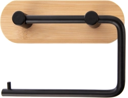 Stijlvolle toiletpapierhouder combineert natuurlijk bamboe met matzwart metaal voor een modern uiterlijk. Biedt gemakkelijke toegang tot papier, een stevige metalen constructie en borenvrije montage met 3M-tape voor snelle installatie op tegels of andere gladde oppervlakken.
