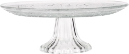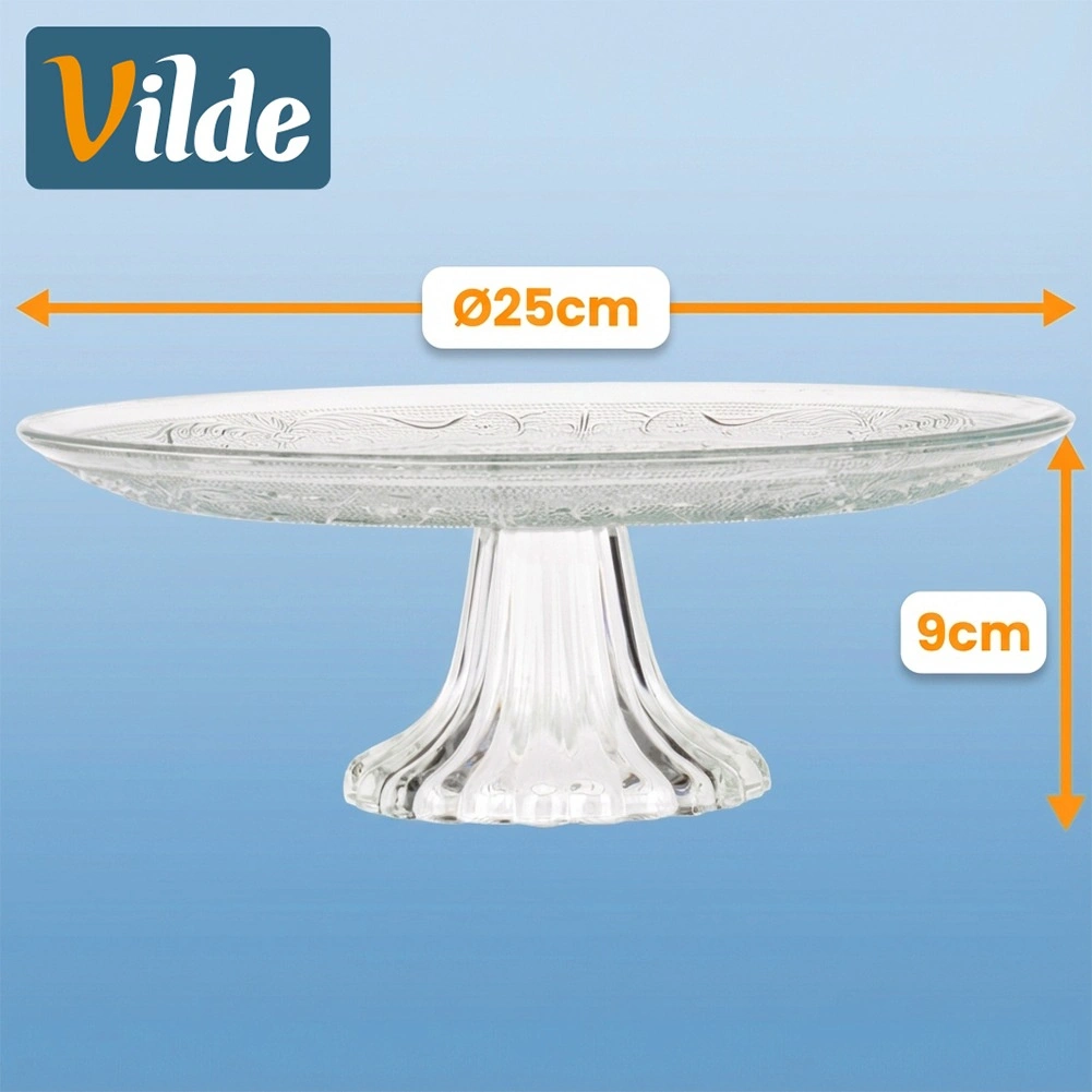 De glazen taartschaal op voet is ideaal voor het serveren en presenteren van taarten, cakes, gebak en hartige hapjes. De klassieke ronde vorm met decoratief reliëf past perfect bij elke tafelsetting en accentueert de uitstraling van de geserveerde lekkernijen.