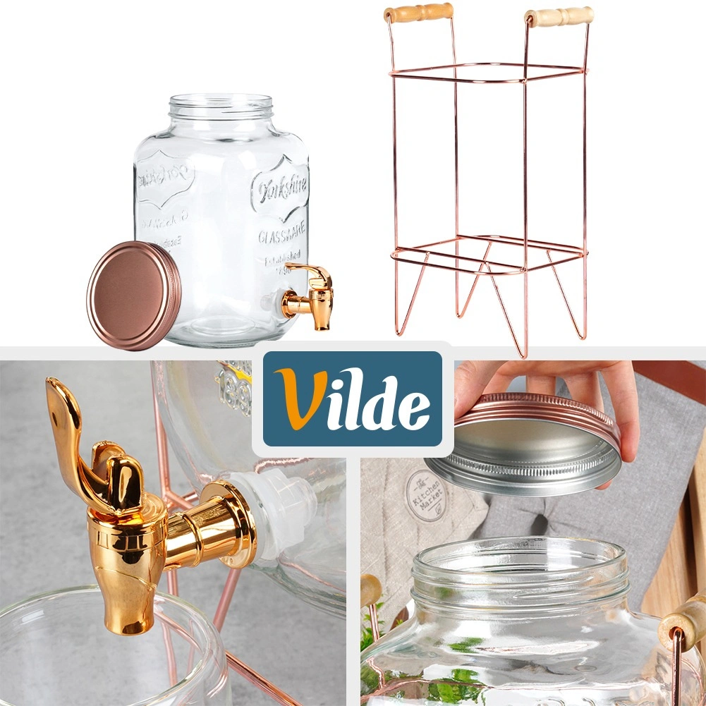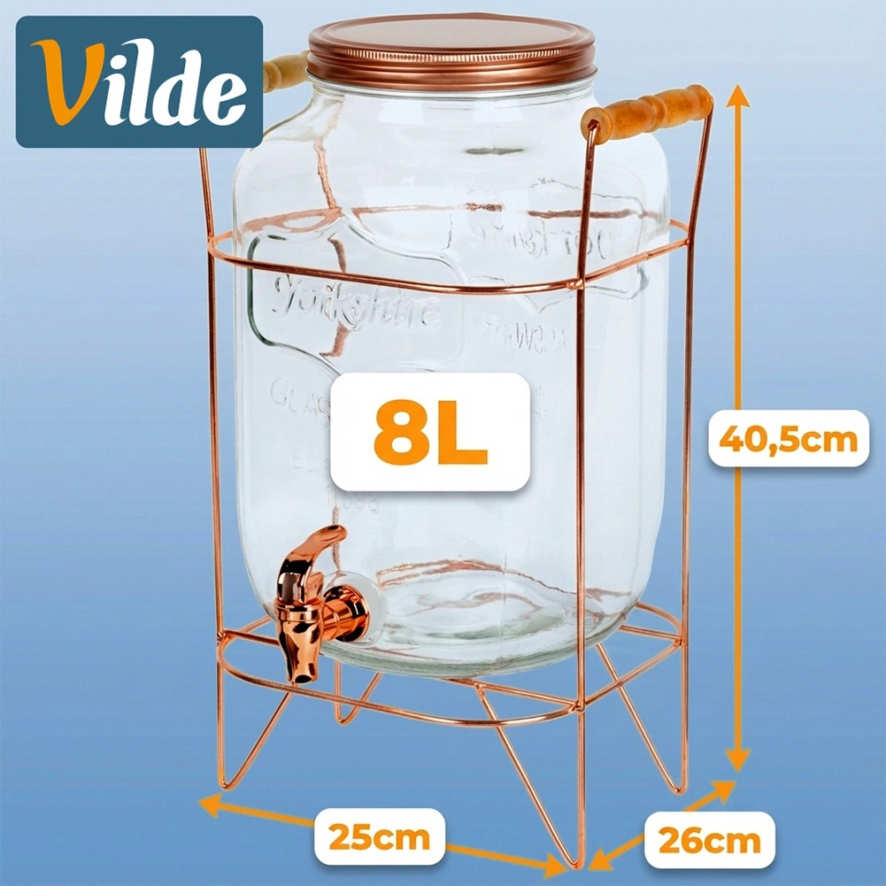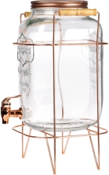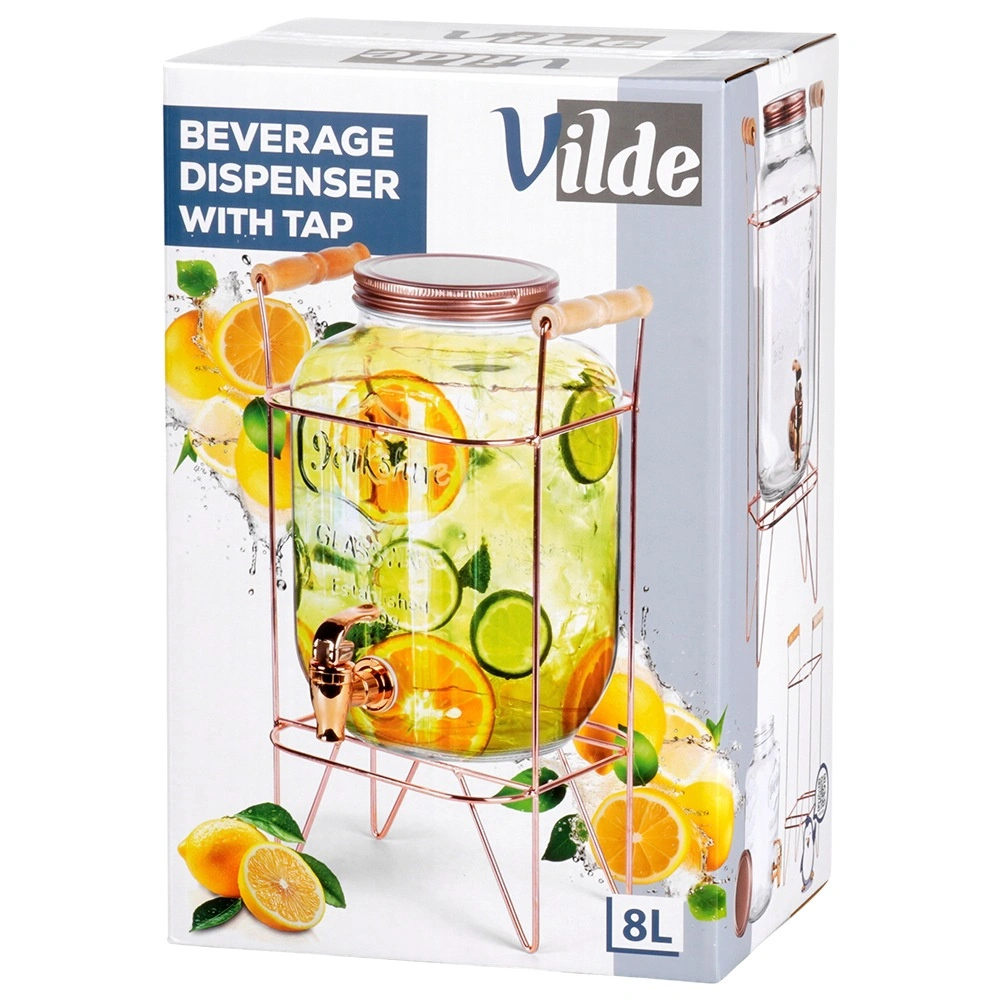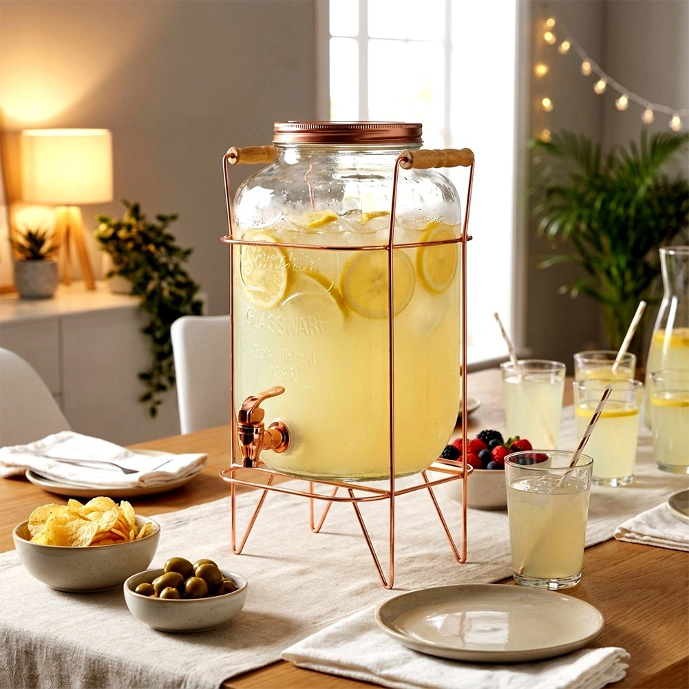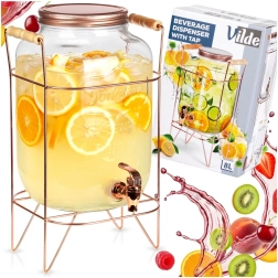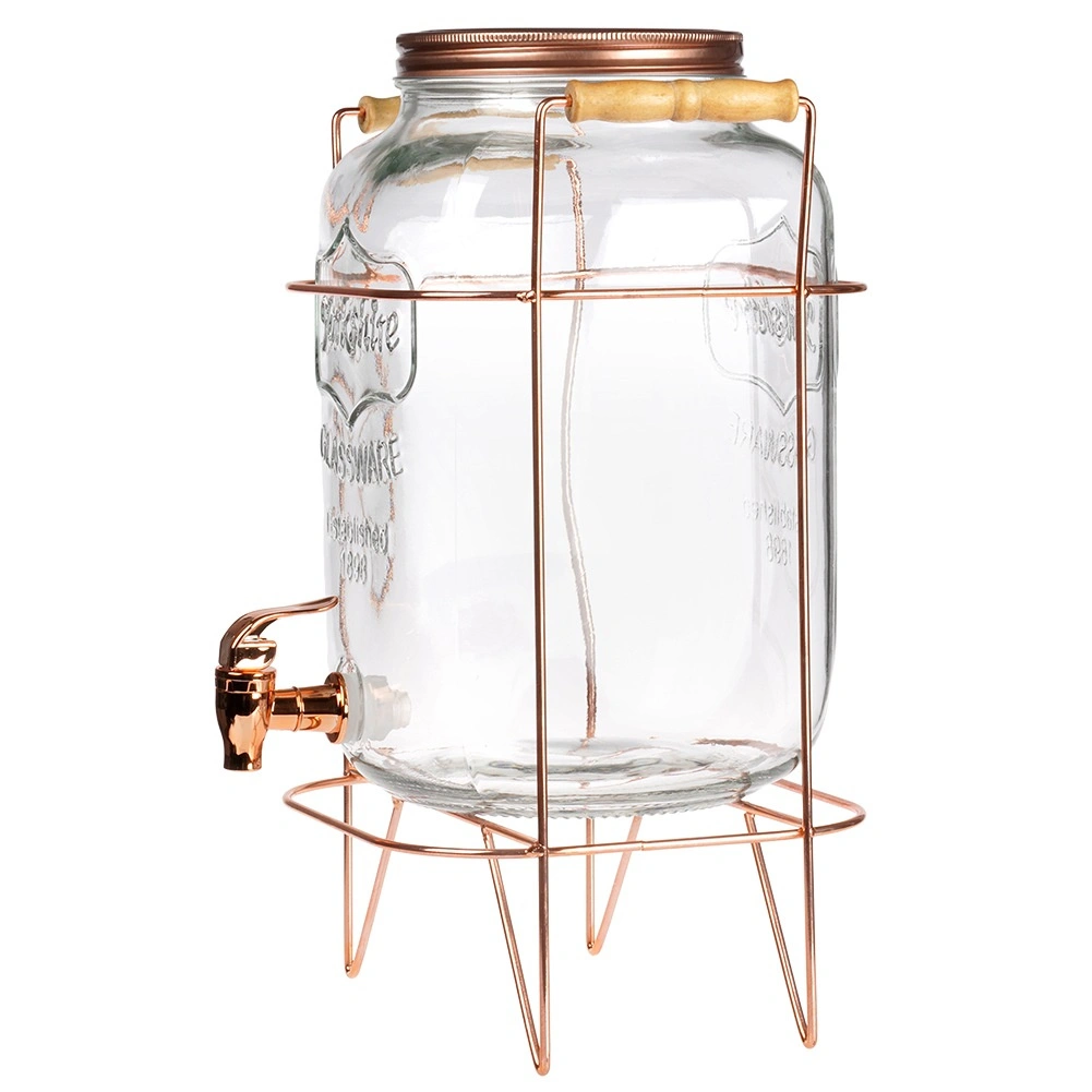 Stijlvolle glazen drankdispenser met een inhoud van 8 l op een stabiele metalen standaard in roségoud, ideaal voor het serveren van limonade, punch of ijsthee. Dankzij de brede hals vul je de drank eenvoudig met fruit en ijs, de praktische kraan zorgt voor comfortabel tappen en het schroefdeksel beschermt de inhoud tegen vuil en insecten. Robuust glas, elegant design en comfortabele houten handgrepen aan de standaard maken van deze dispenser de perfecte keuze voor tuinfeesten en thuisbijeenkomsten.