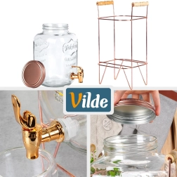 De set bevat een glazen kan/dispenser, een metalen standaard en een metalen schroefdeksel in roségoud. Geschikt voor water, huisgemaakte limonades, gearomatiseerd water, sappen, ijsthee en punch. Perfect voor in de tuin, op het terras en binnen.