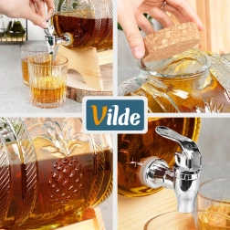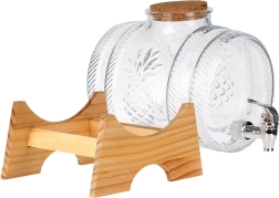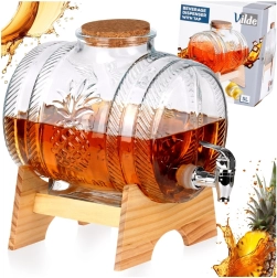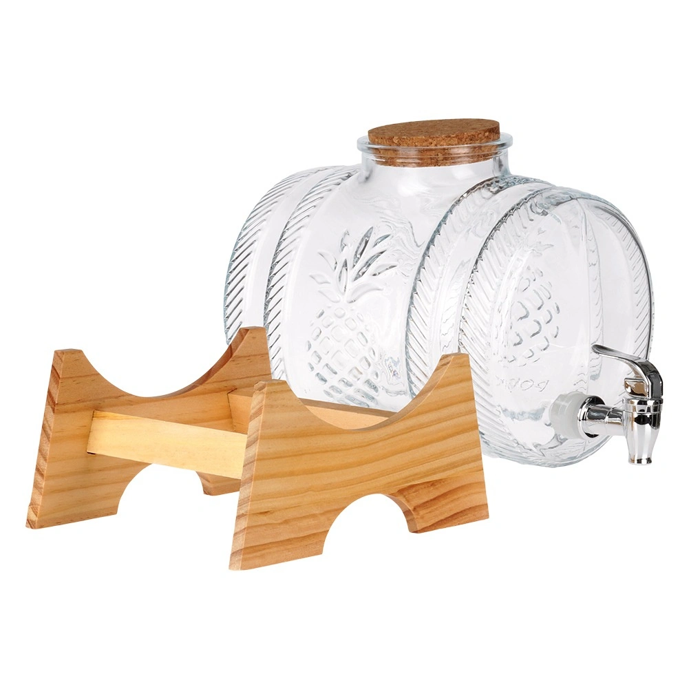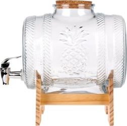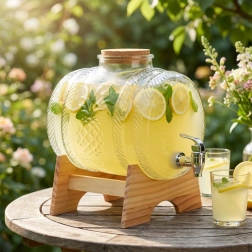 Deze elegante drankdispenser combineert hoogwaardig, dik glas met een decoratief ananasreliëf, een metalen kraan voor soepel tappen en een houten standaard voor stabiliteit en comfort. Dankzij het volume van 5 liter is hij perfect voor tuinfeesten, familiebijeenkomsten en stijlvolle buffetten. Het kurken deksel houdt de drank vers en vrij van insecten.