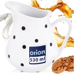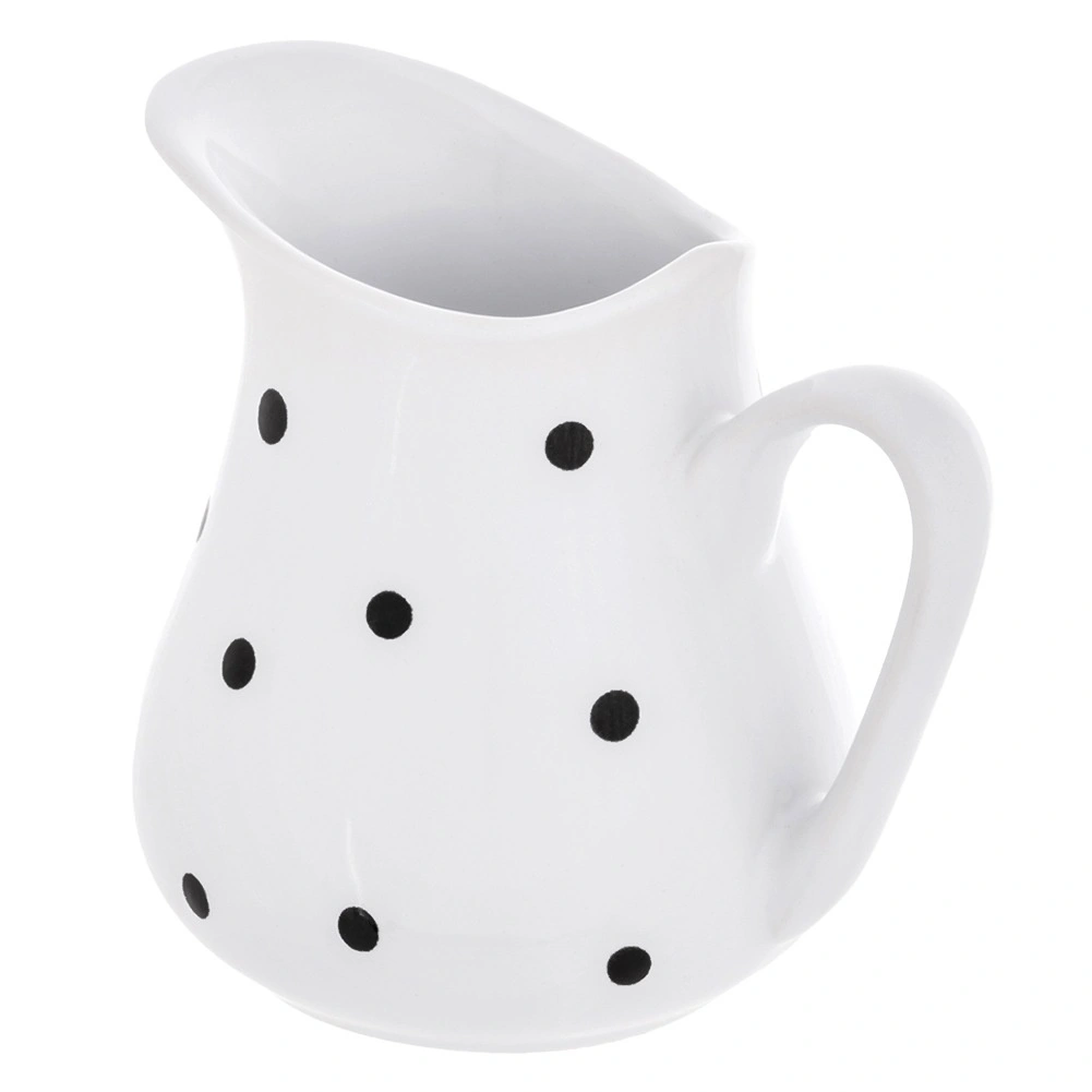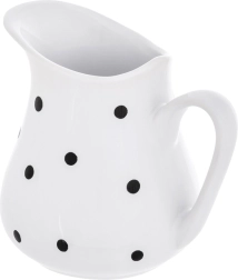 Stijlvolle keramische kan met een inhoud van 480 ml in het wit met zwarte stippen, ideaal voor dagelijks serveren. Biedt universeel gebruik voor water, limonade, wijn, melk, room of sauzen, heeft een ergonomisch handvat en een brede schenktuit voor exact schenken zonder spatten. Vaatwasser- en magnetronbestendig en dankzij het decoratieve design een blikvanger op elke tafel.