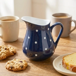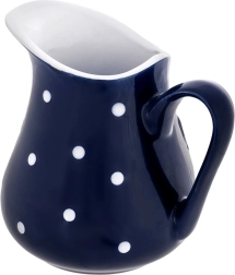 Deze veelzijdige kan combineert functionaliteit met esthetiek. Dankzij de inhoud van 480 ml serveert u comfortabel melk bij de koffie, room, limonade en ook huisgemaakte sauzen. De glanzende glazuur in donkerblauw met witte stippen geeft het tafelen charme en staat decoratief in zowel de keuken als op de eettafel.