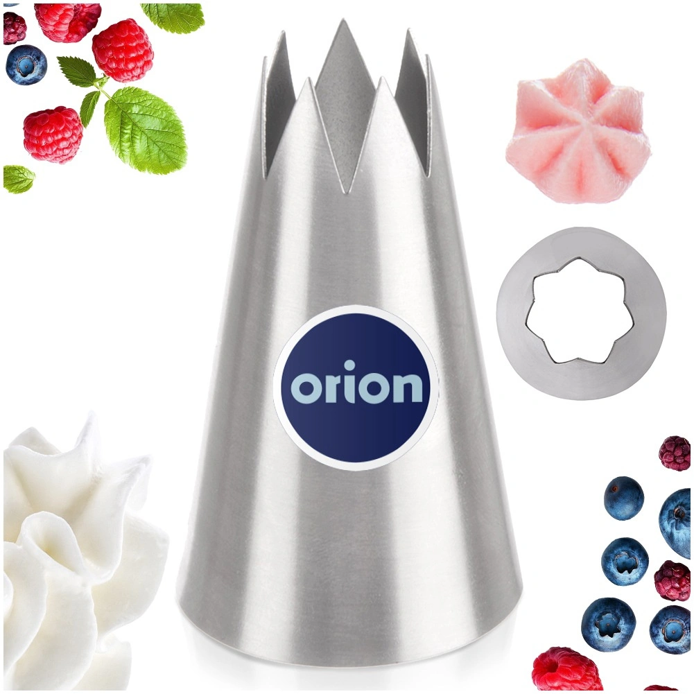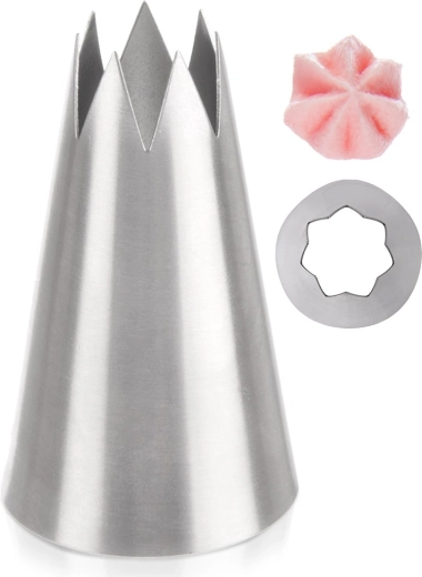 Universele RVS spuitmond in bloemvorm voor eenvoudig decoreren van taarten, cupcakes en desserts. Dankzij de brede opening creëert hij effectvolle bloemmotieven, is duurzaam, voedselveilig en vaatwasserbestendig. Compatibel met wegwerp- en herbruikbare spuitzakken.