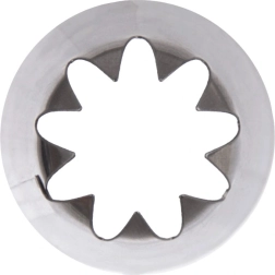 Dit stervormige spuitmondje van RVS is een betrouwbare hulp voor het maken van opvallende sterretjes, rozetten, randen en bloemmotieven. Dankzij de precieze snit bereik je strakke lijnen en een professionele uitstraling van je desserts.