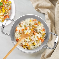 De roestvrijstalen pan VENICE 18 cm (2,3 l) combineert een elegante look met dagelijks gebruiksgemak. Gemaakt van hoogwaardig roestvrij staal 304 met een gepolijste afwerking, aangevuld met een robuust glazen deksel. De meerlaagse bodem met aluminium kern zorgt voor snel en gelijkmatig opwarmen voor efficiënt en betrouwbaar koken.