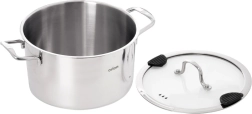 Universele roestvrijstalen pan 22 cm met inhoud van 4,3 l voor dagelijks koken, stoven en bakken. Duurzaam roestvrij staal 304, meerlagige bodem met aluminium voor gelijkmatige verwarming en glazen deksel met schenktuit en siliconen elementen voor eenvoudig afgieten. Geschikt voor gas, elektrisch, keramisch en inductie, ovenbestendig tot 200 °C en vaatwasserbestendig.