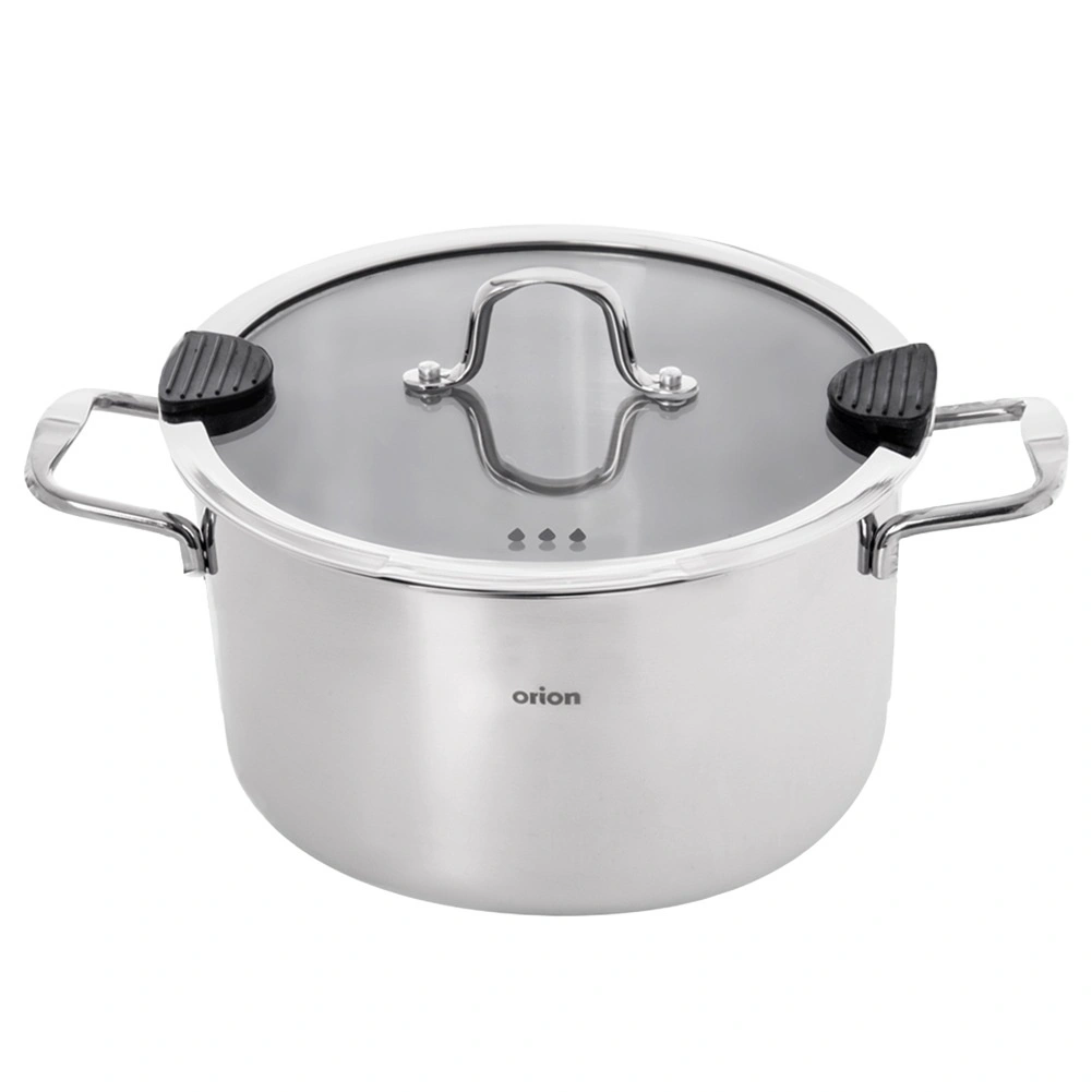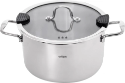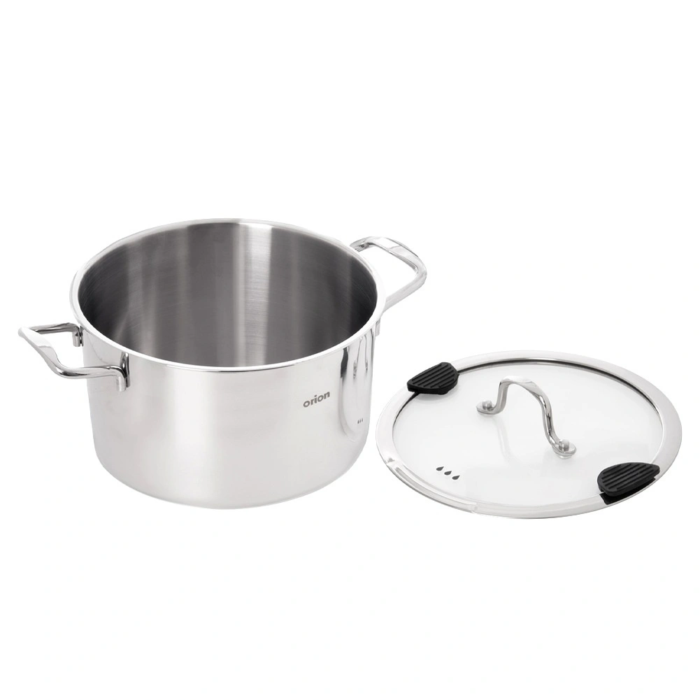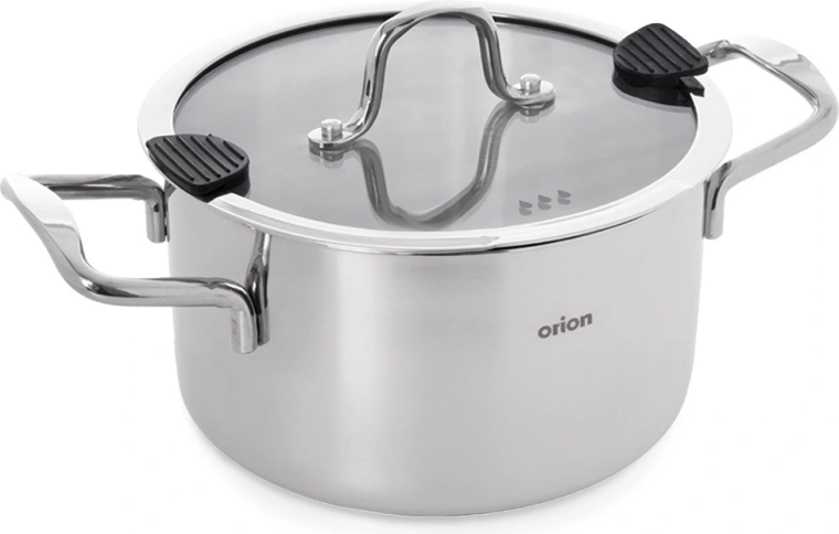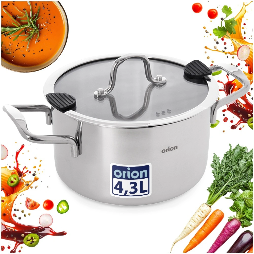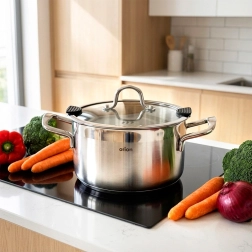 Praktische en duurzame pan van gepolijst roestvrij staal 304 met glazen deksel, ideaal voor soepen, goulash, eenpansgerechten en gebraden vlees. Dankzij de meerlagige bodem met aluminium kern wordt de warmte gelijkmatig verdeeld en versnelt het koken. Het glazen deksel met geïntegreerde schenktuit en siliconen grepen maakt veilig afgieten zonder vergiet mogelijk.
