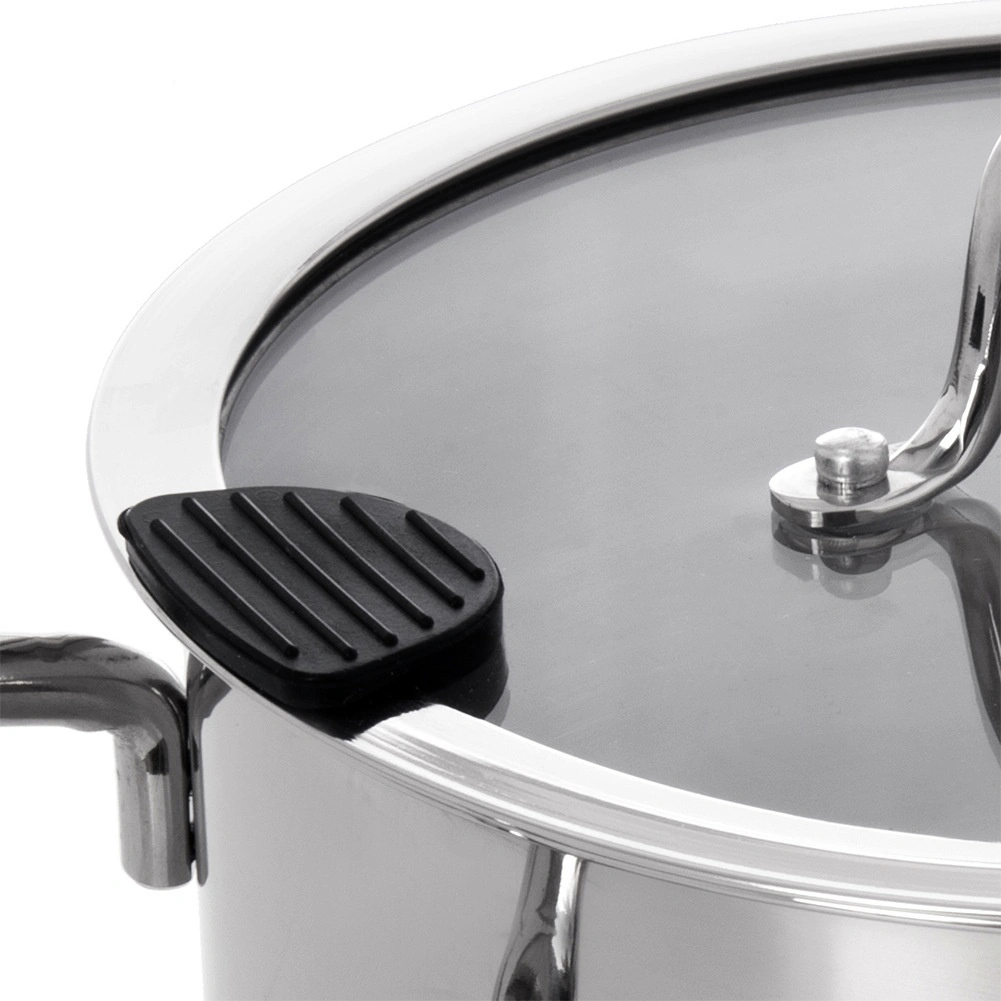 Gehard glas met praktische openingen en siliconen elementen maakt het mogelijk om water en stoom veilig af te gieten zonder vergiet – snel, schoon en comfortabel.