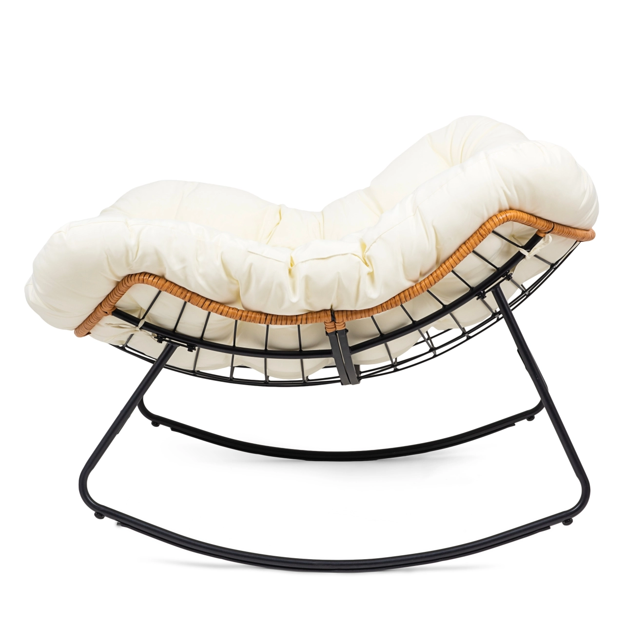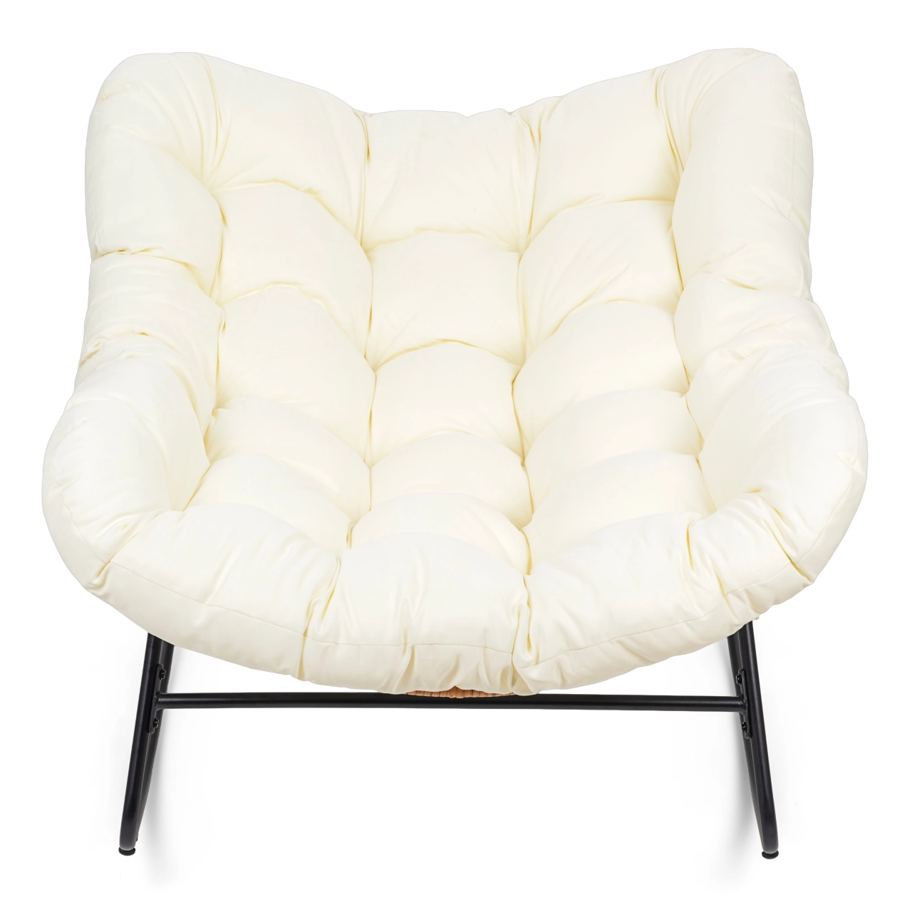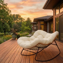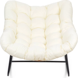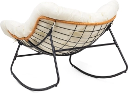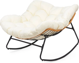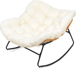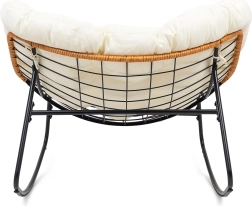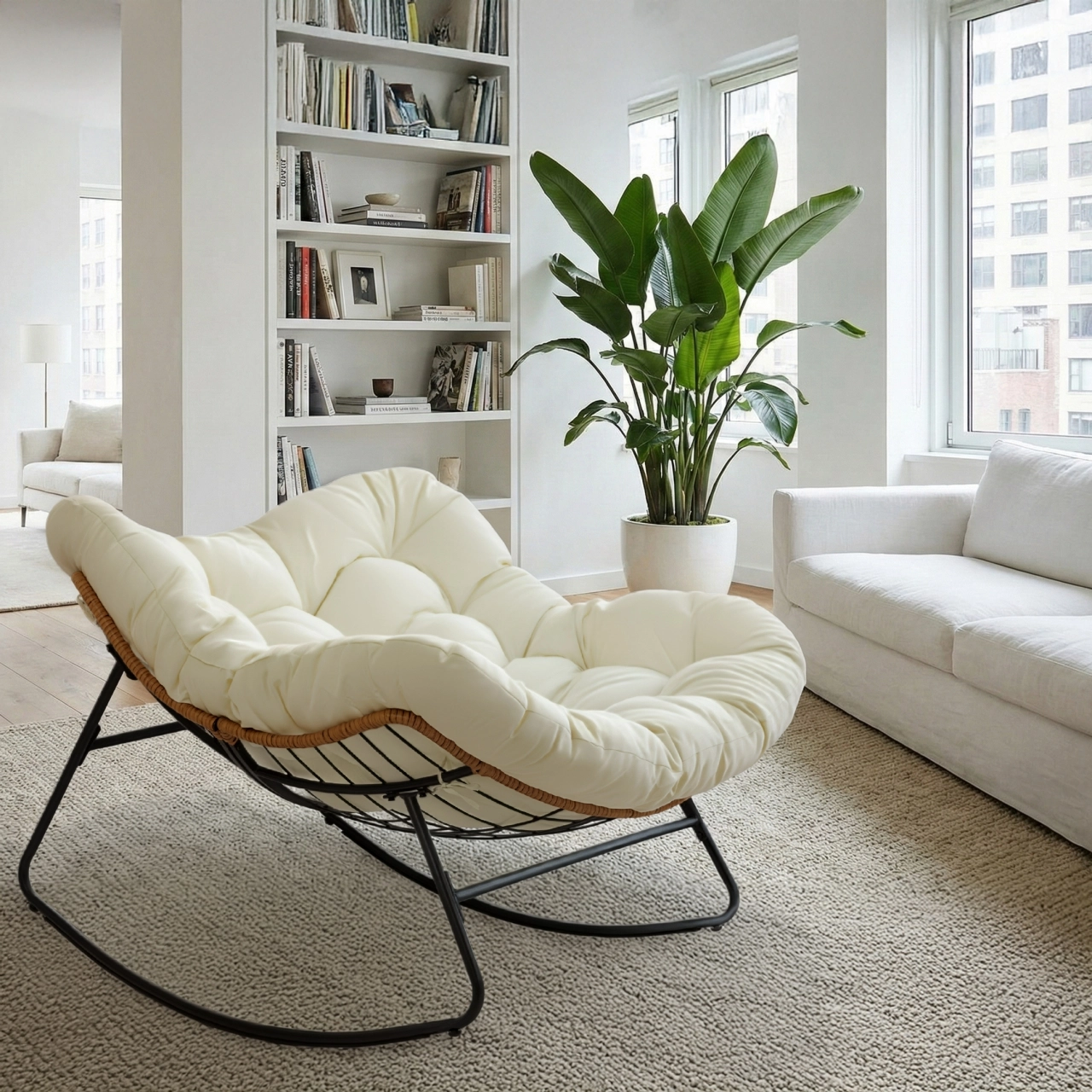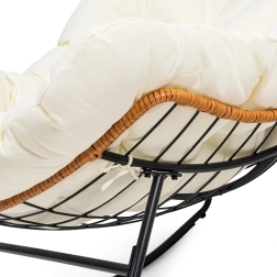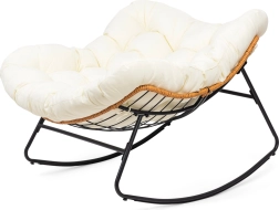 Ontdek je eigen relaxzone: de XL schommelstoel biedt diep, nestachtig comfort, zacht schommelen voor lezen en ontspannen, en een neutrale beige tint die in elk interieur past. De stabiele metalen constructie, zachte doorgestikte kussen en luchtige opengewerkte kuip met rattanaccent benadrukken de lichtheid van de scandi-esthetiek.