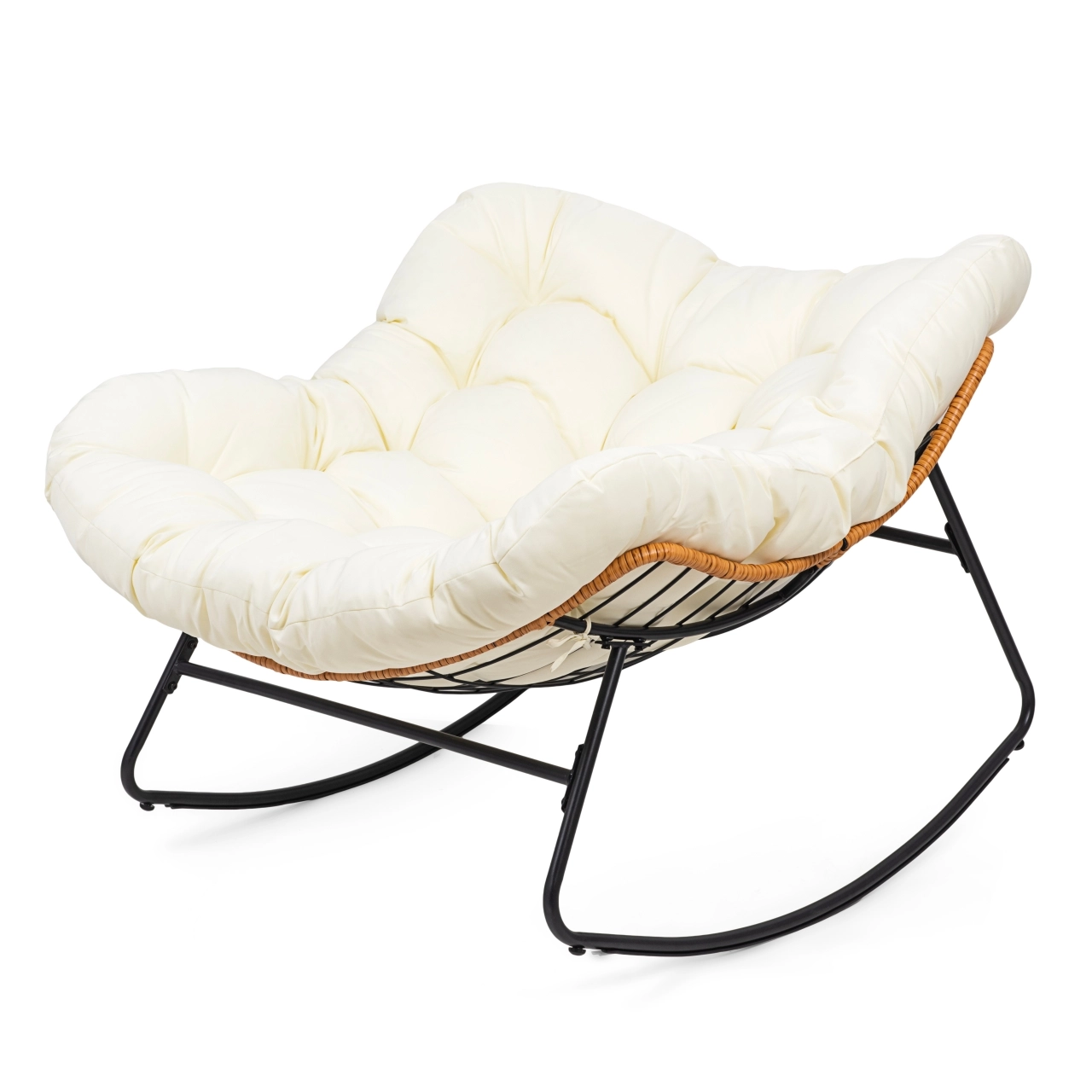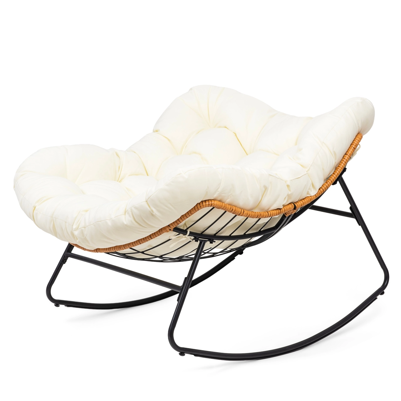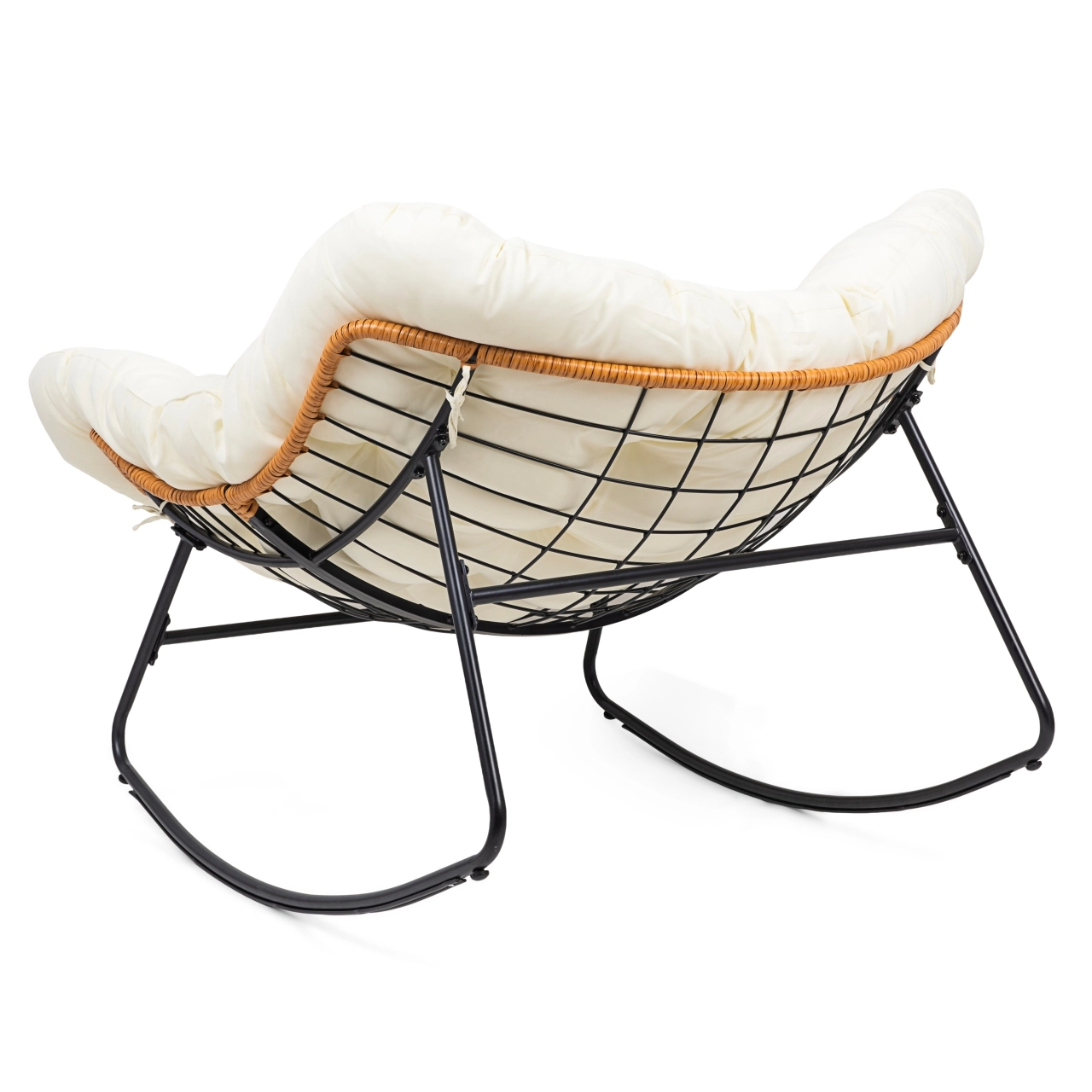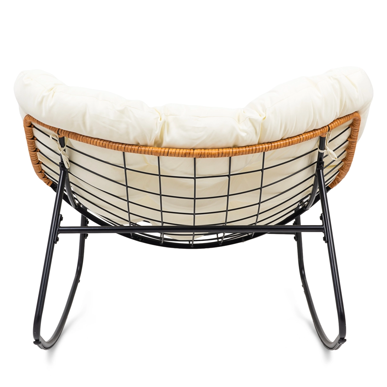 Ontdek je eigen relaxzone: de XL schommelstoel biedt diep, nestachtig comfort, zacht schommelen voor lezen en ontspannen, en een neutrale beige tint die in elk interieur past. De stabiele metalen constructie, zachte doorgestikte kussen en luchtige opengewerkte kuip met rattanaccent benadrukken de lichtheid van de scandi-esthetiek.
