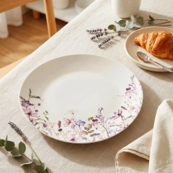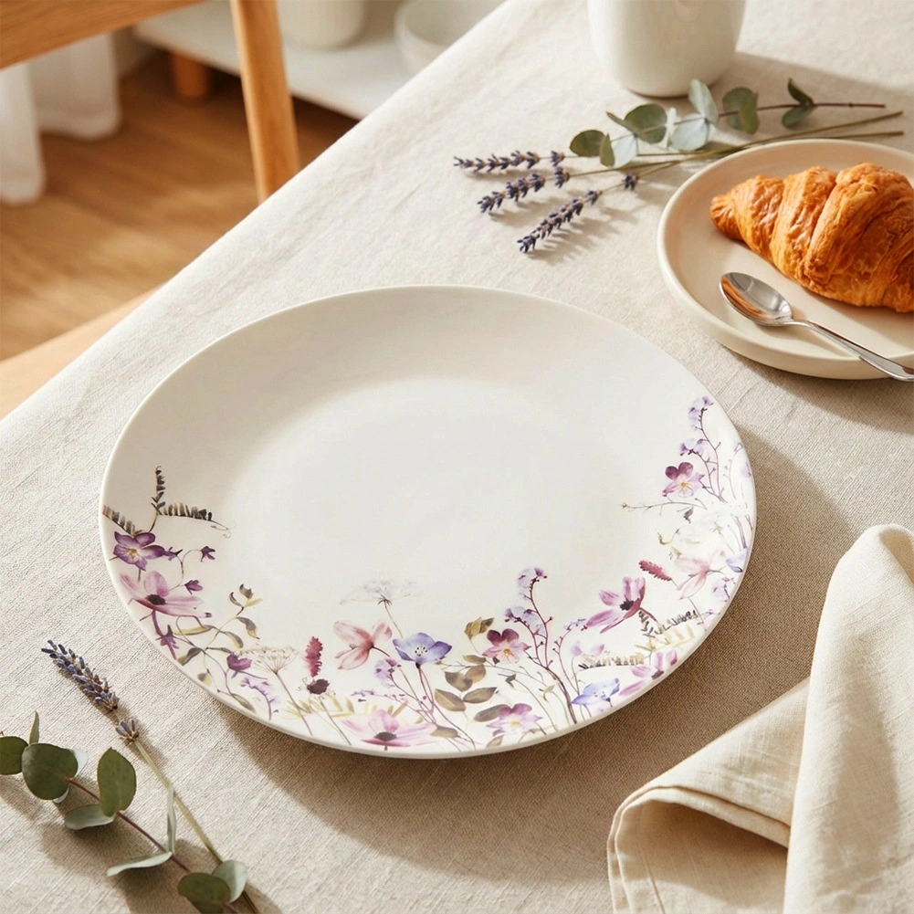Elegant porseleinen dessertbord met een diameter van 20,5 cm met een motief van weidebloemen. Ideaal voor taartjes, tussendoortjes en ontbijt. Geschikt voor vaatwasser en magnetron, gemaakt van hoogwaardig porselein en passend bij elke tafelsetting.