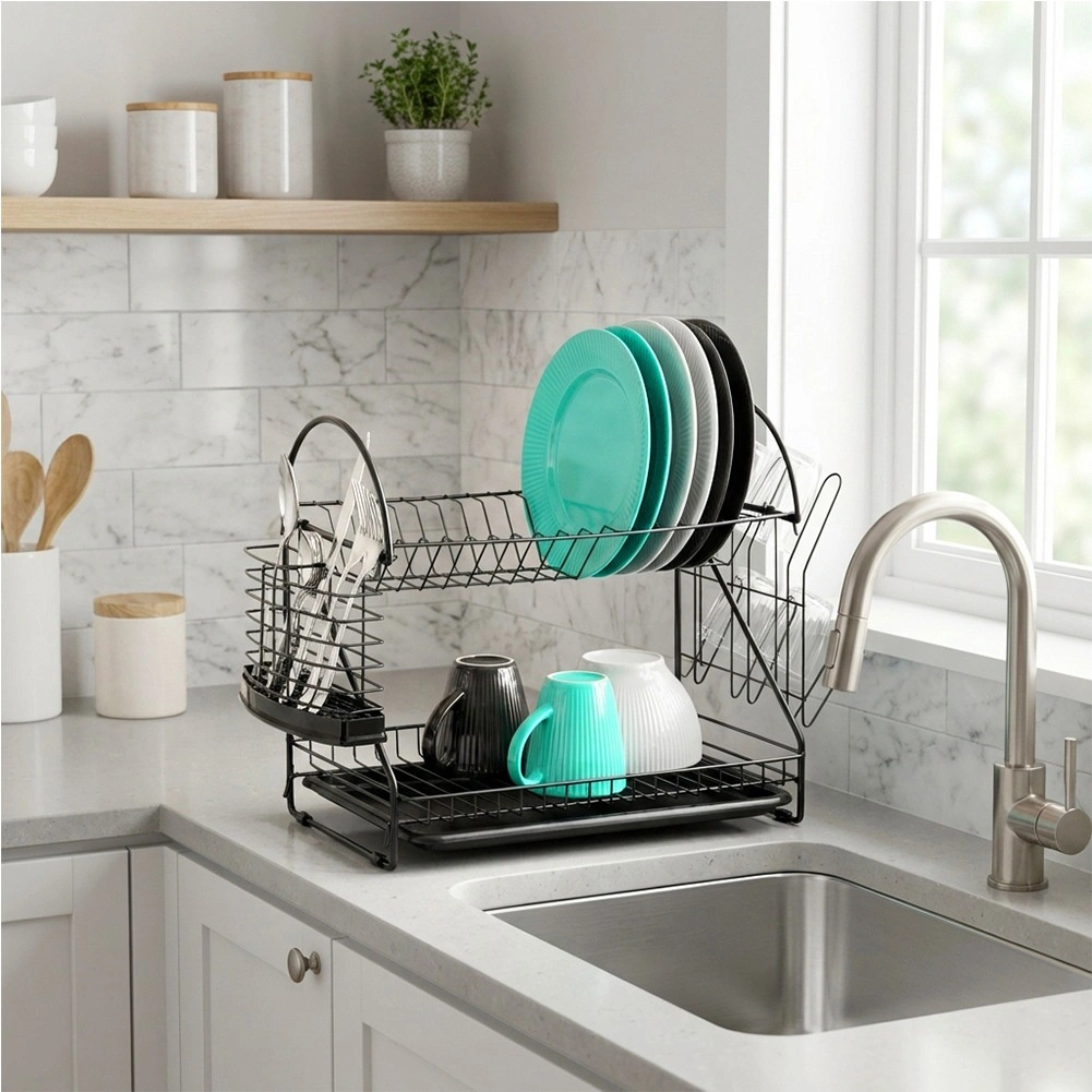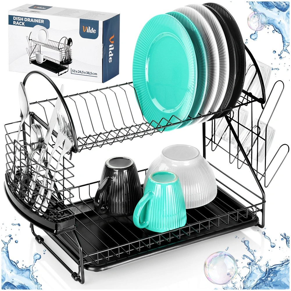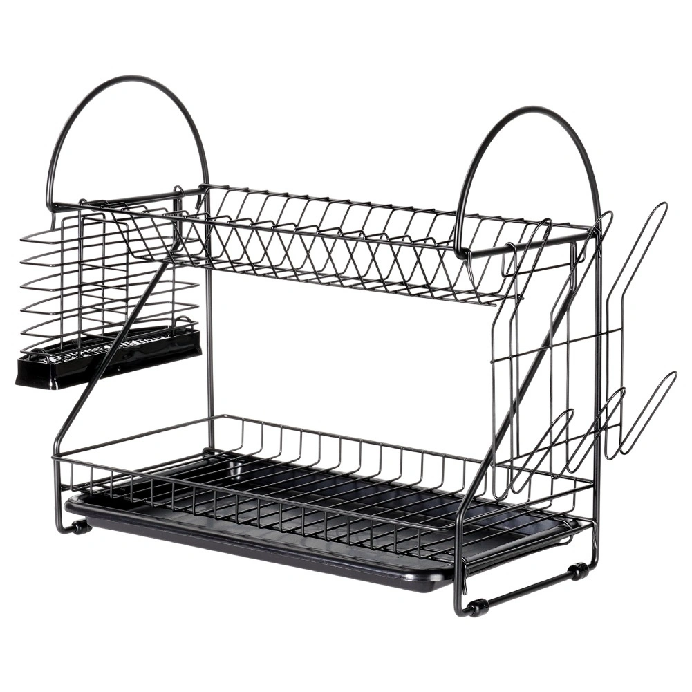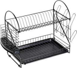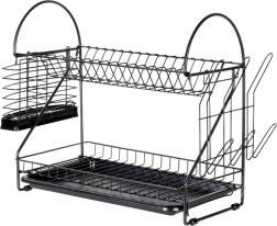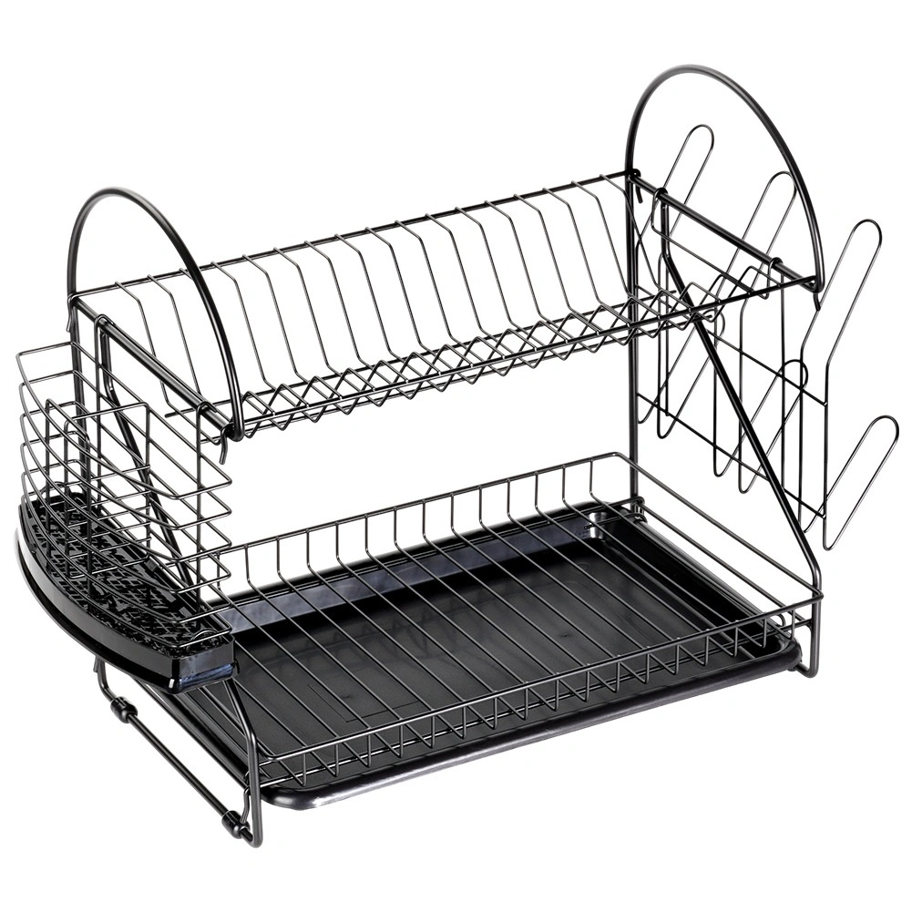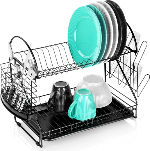Praktisch afdruiprek met twee niveaus in elegant zwart maakt dagelijks afwassen en drogen makkelijker. Biedt een bovenrek voor borden, een onderste vlak voor kommen en glazen, een afneembaar bestekbakje en een zijhouder voor snijplanken. Dankzij de grote capaciteit en de afdruiptray blijft je keuken schoon en georganiseerd.