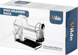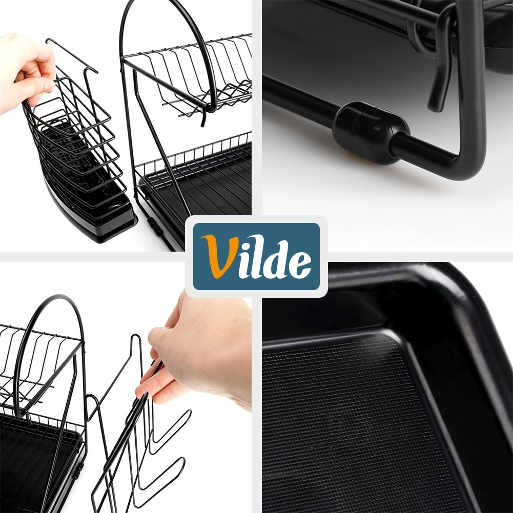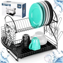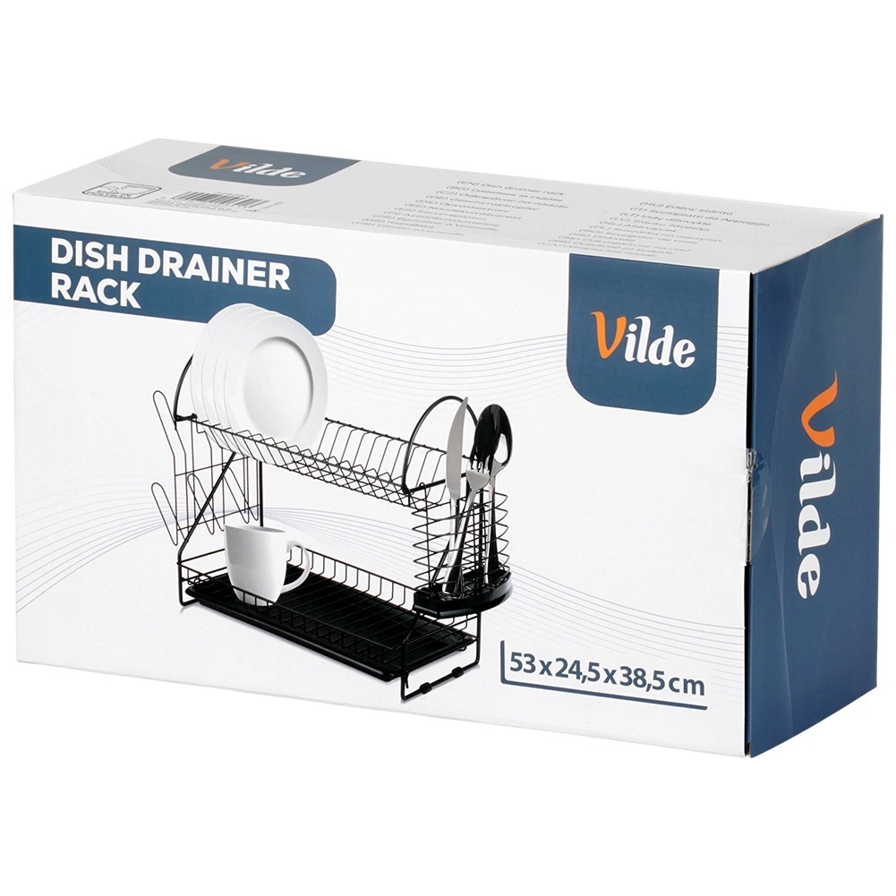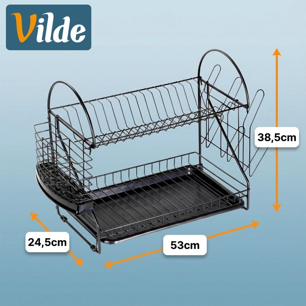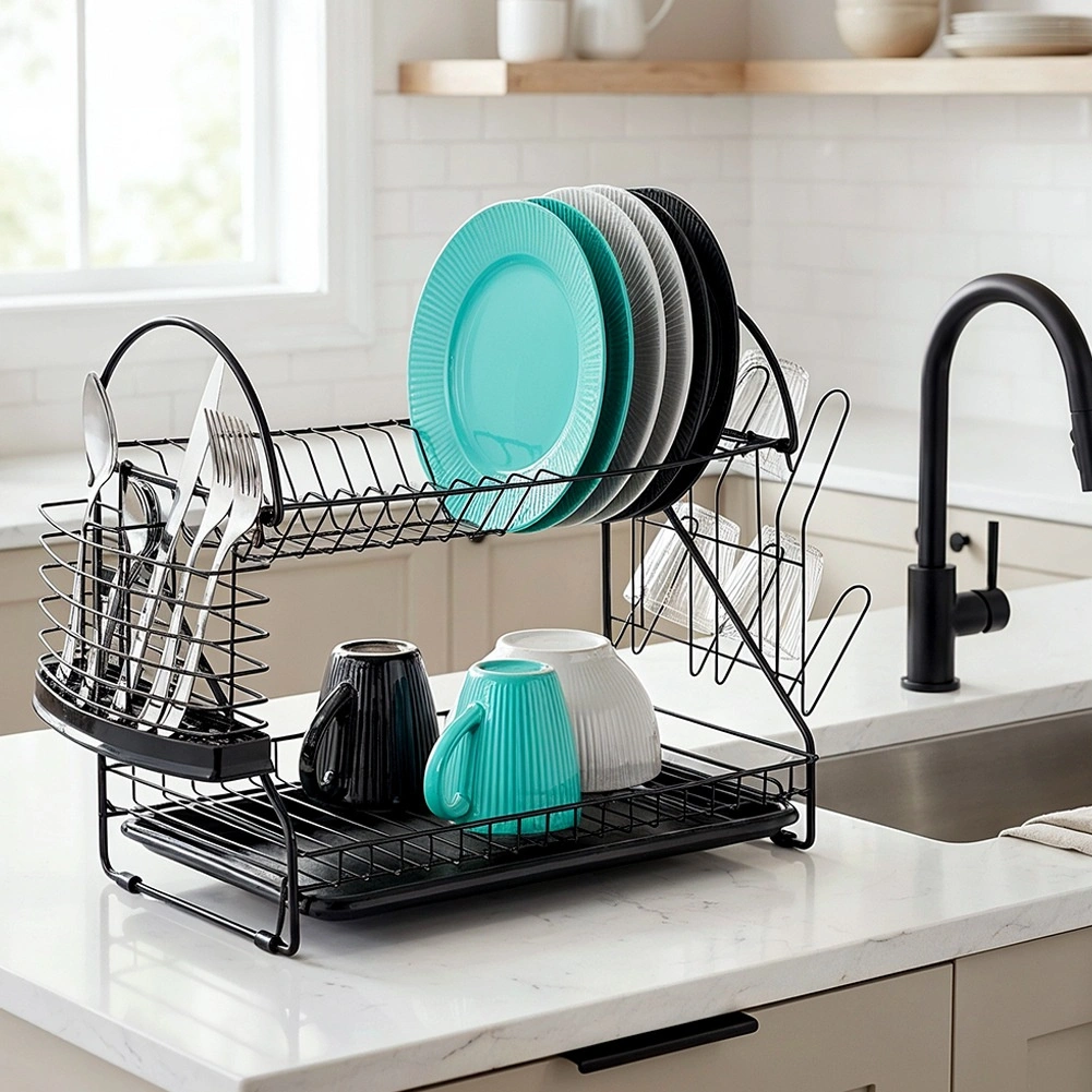 Praktisch afdruiprek met twee niveaus in elegant zwart maakt dagelijks afwassen en drogen makkelijker. Biedt een bovenrek voor borden, een onderste vlak voor kommen en glazen, een afneembaar bestekbakje en een zijhouder voor snijplanken. Dankzij de grote capaciteit en de afdruiptray blijft je keuken schoon en georganiseerd.
