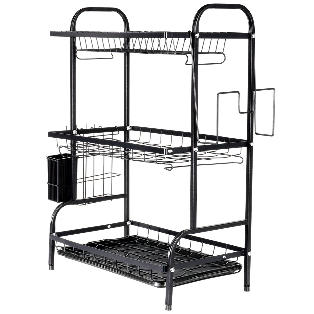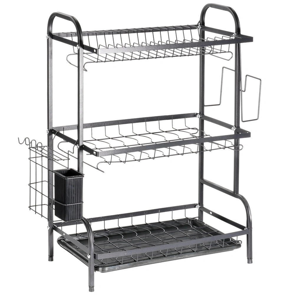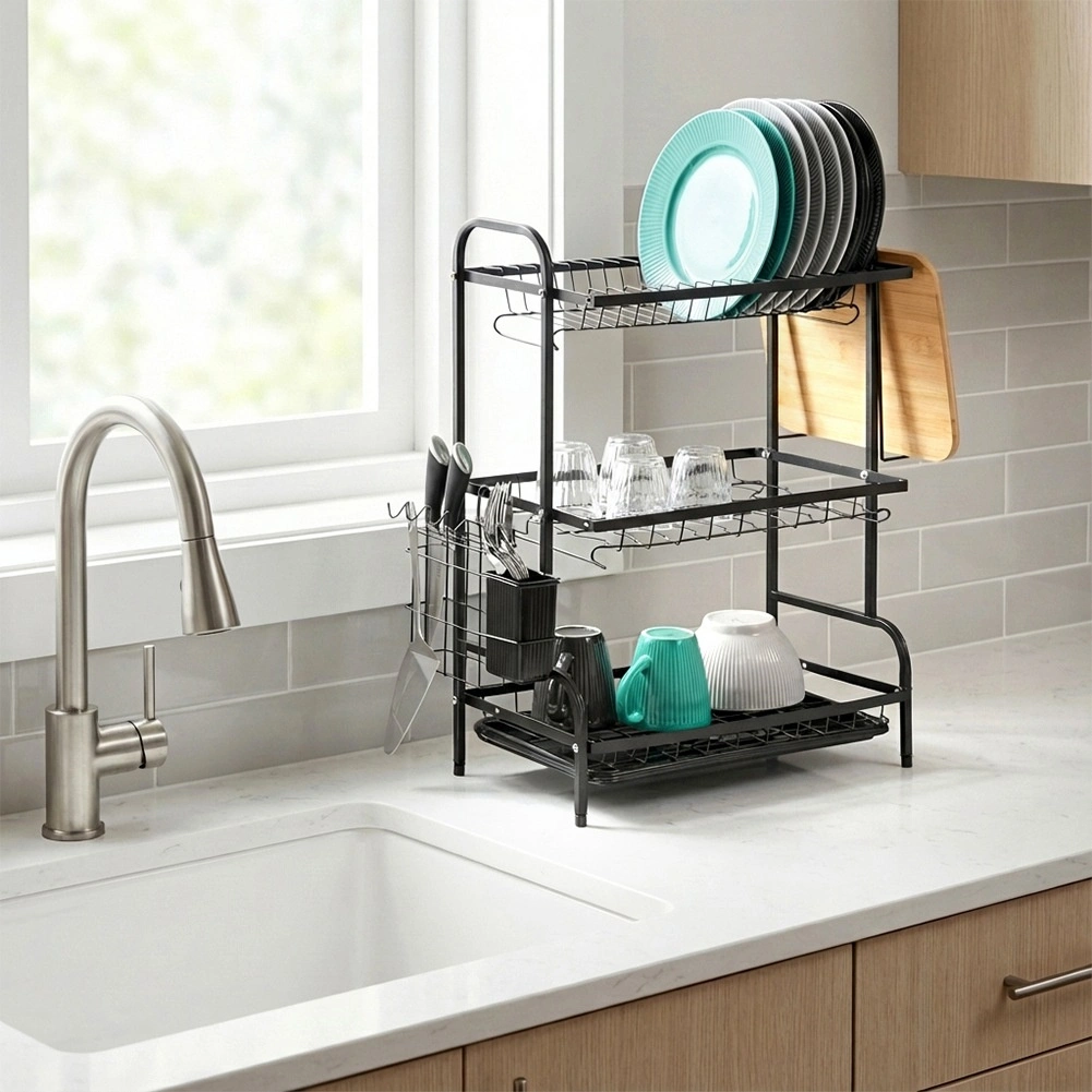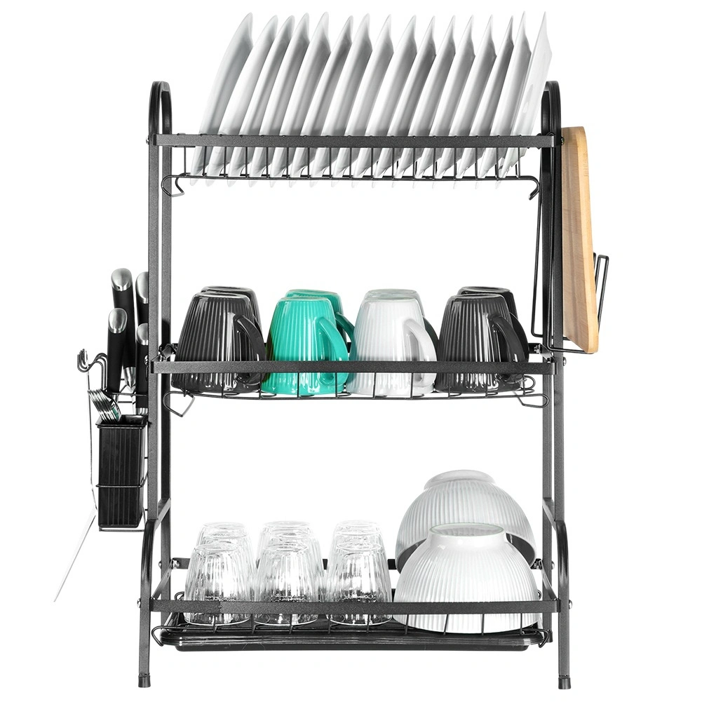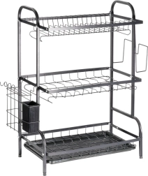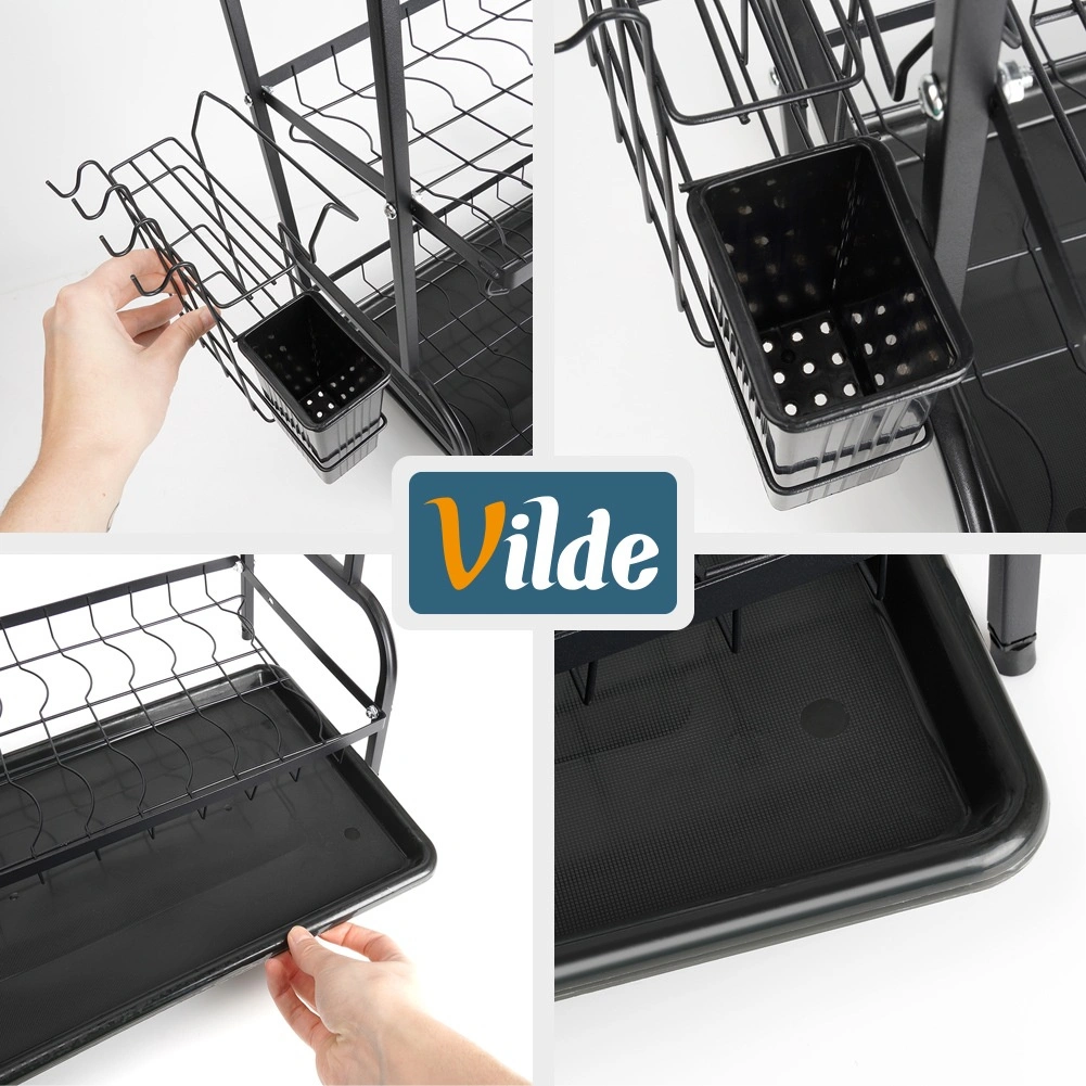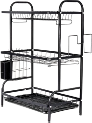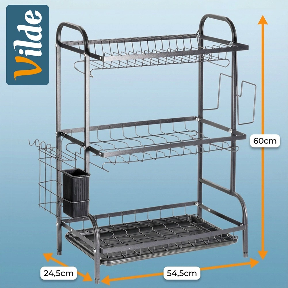 Maximaliseer de ruimte bij de gootsteen met dit driedelige zwarte afdruiprek van duurzaam metaal. Het bovenste niveau biedt plaats aan tot 16 borden, de onderste niveaus zijn ideaal voor kommen, glazen en mokken. Het afneembare bestekmandje en de zijdelingse houder voor een snijplank vergroten het droogoppervlak, terwijl de uitneembare afdruipschaal water opvangt en het werkblad droog houdt.