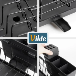 De geïntegreerde schenktuit in de bak zorgt voor een gecontroleerde afvoer van water rechtstreeks naar de gootsteen, zodat het werkblad vrij blijft van natte plekken. Het afdruiprek past in elke keuken – van modern tot klassiek – en dankzij het eenvoudige onderhoud bespaart het elke dag tijd. Origineel product van het merk VILDE, vervaardigd volgens Europese normen.