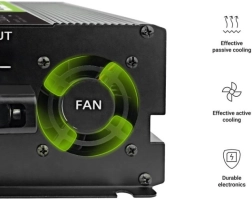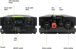 Het geïntegreerde LCD‑display toont spanning, belasting en de geschatte laadstatus van de accu, zodat u eenvoudig onderspanning en overbelasting voorkomt. De robuuste geribde metalen behuizing, twee AC‑stopcontacten en efficiënte koeling zorgen voor betrouwbare werking, ook bij zware belasting.