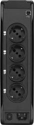 Capaciteit van 1300 VA / 840 W en 4 Schuko-stopcontacten + 4 overspanningsuitgangen zorgen voor betrouwbare voeding van tv, gameconsoles, pc en andere elektronica zonder IEC-adapters.