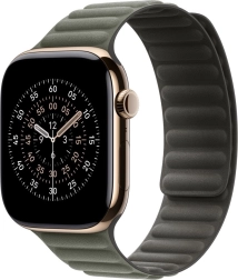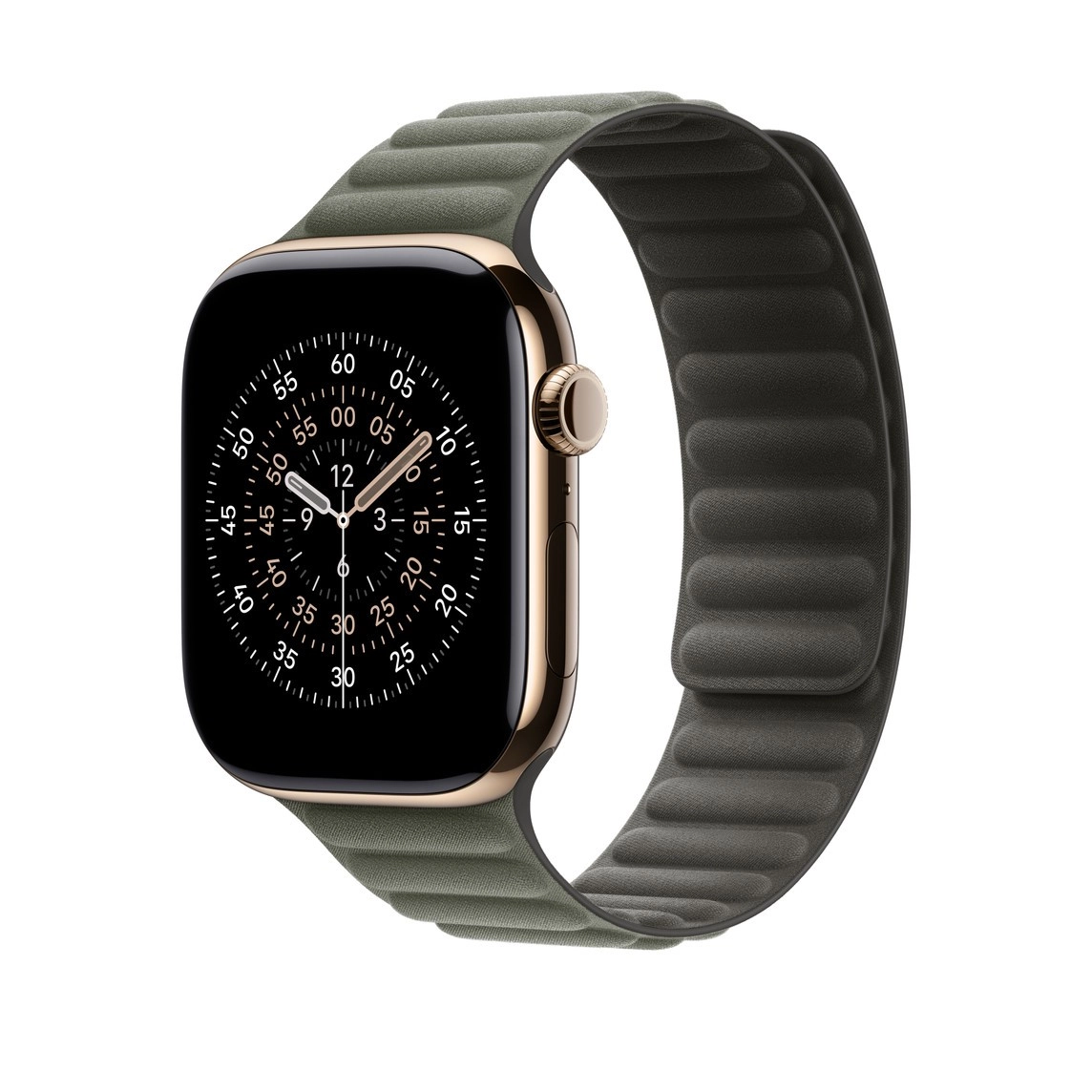 Het gecarboneerde, subtiel geribde ontwerp van FineWoven-materiaal biedt een zachte touch en een elegante uitstraling. Speciaal gevormde magneten trekken de band automatisch aan en spannen hem lichtjes bij beweging van de hand, zodat hij de hele dag stevig en comfortabel op zijn plaats blijft.