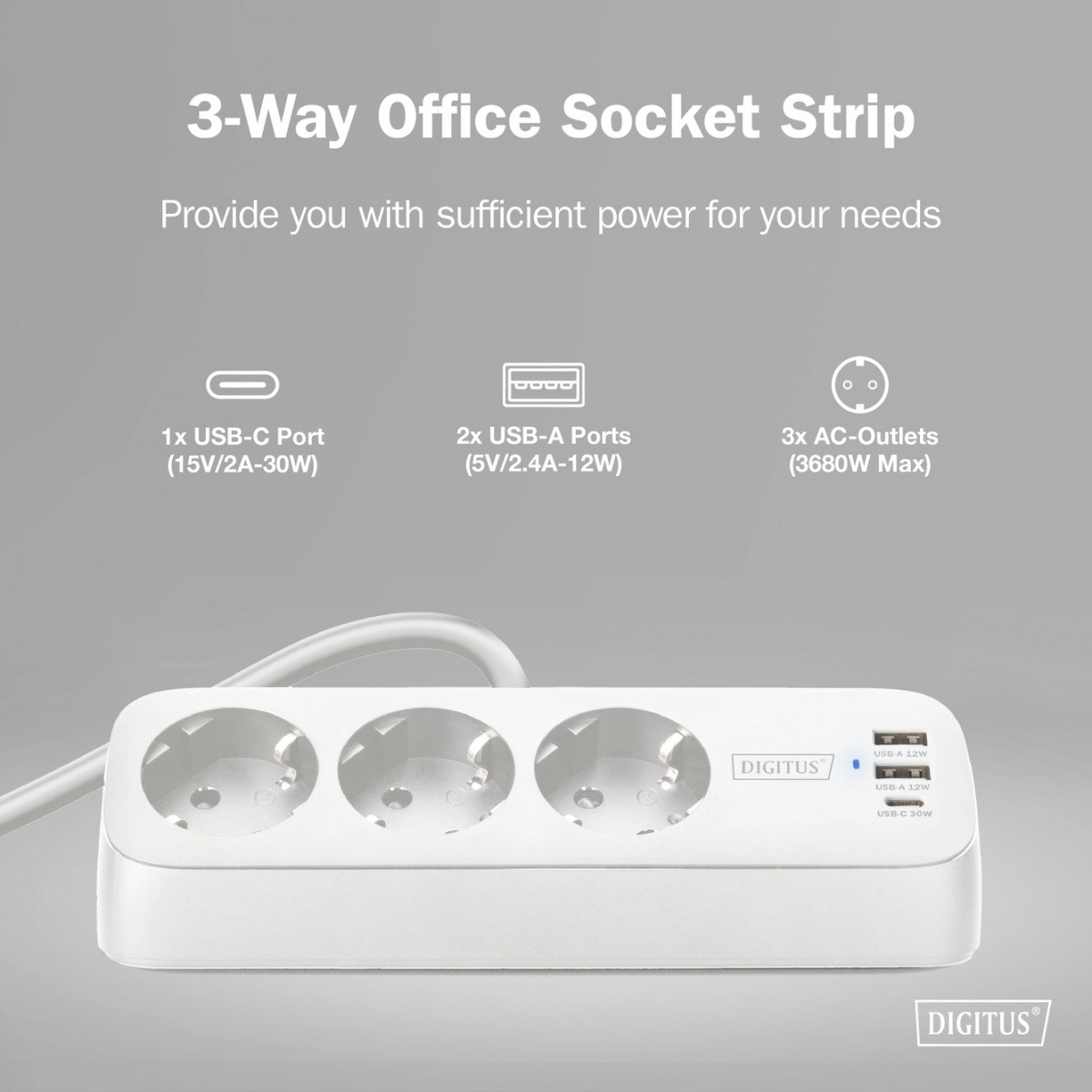 2× USB‑A (5 V/2,4 A, 12 W elk), 1× USB‑C (15 V/2 A, 30 W)