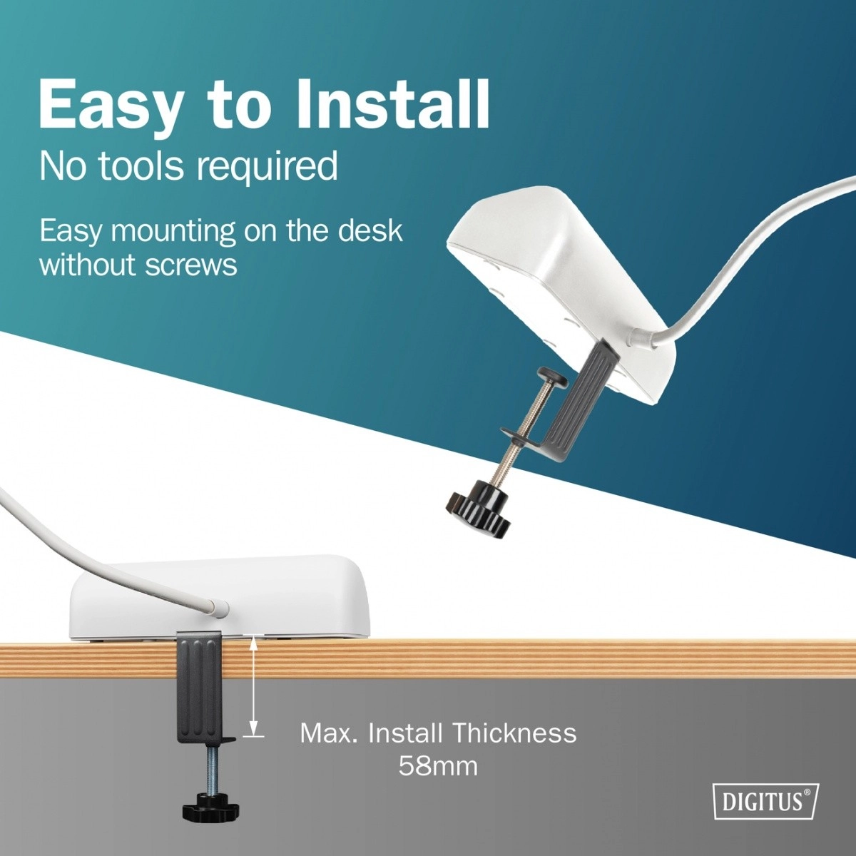 De klem maakt razendsnelle installatie aan de bureaurand mogelijk, zonder schroeven. Voeding en laden heb je veilig en overzichtelijk binnen handbereik.