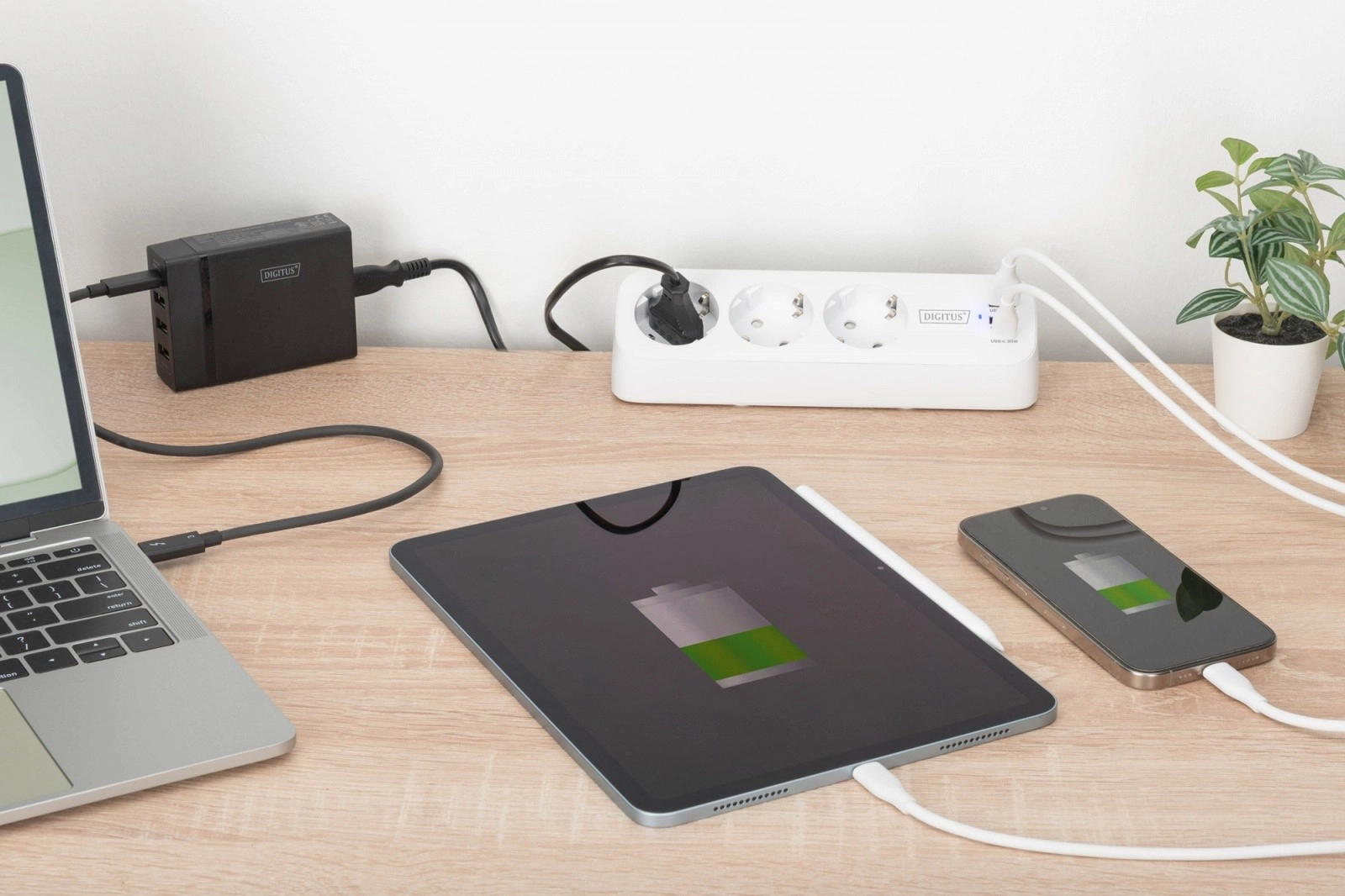 • 3× Schuko + USB‑voeding – alles binnen handbereik op het werkblad