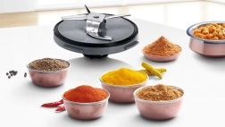 De slimme opbergmethode van opzetstukken direct in de kom bespaart ruimte en versnelt het werk. Dankzij duidelijke markeringen is het wisselen van schijven en messen in een oogwenk gedaan.