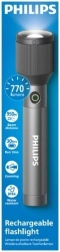 Compacte oplaadbare PHILIPS-zaklamp met opladen via USB‑C, lichtopbrengst van 770 lm, een robuuste aluminium behuizing en een geïntegreerde accu van 3000 mAh voor betrouwbaar licht in huis, in de werkplaats en buitenshuis.