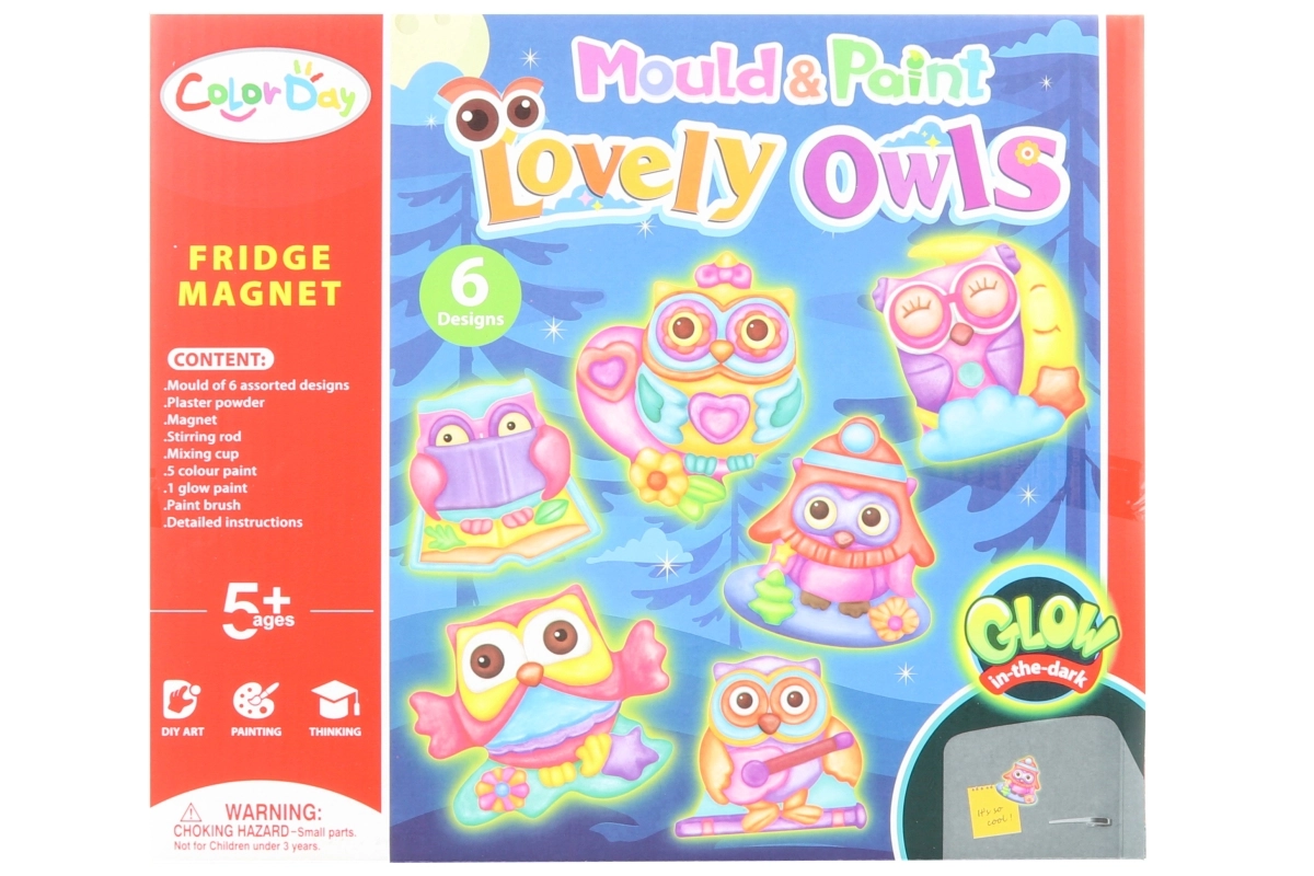 Roer de gips aan, giet deze in de kunststof mal met 6 verschillende motieven, laat uitharden en kleur vervolgens in met de meegeleverde acrylverf. Plak een magneet op de achterkant en je lichtgevende koelkastdecoratie is klaar!