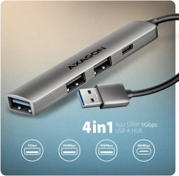 Dunne aluminium USB-hub van AXAGON breidt je notebook of pc eenvoudig uit met vier poorten – 1× USB‑A 5 Gbps voor snelle schijven, 2× USB‑A 480 Mbps voor muis, toetsenbord en printer en 1× USB‑C 480 Mbps voor telefoons en accessoires. Lichte en duurzame aluminium constructie, Plug & Play, Hot Plug en voeding via de USB‑bus zorgen voor probleemloos gebruik overal.