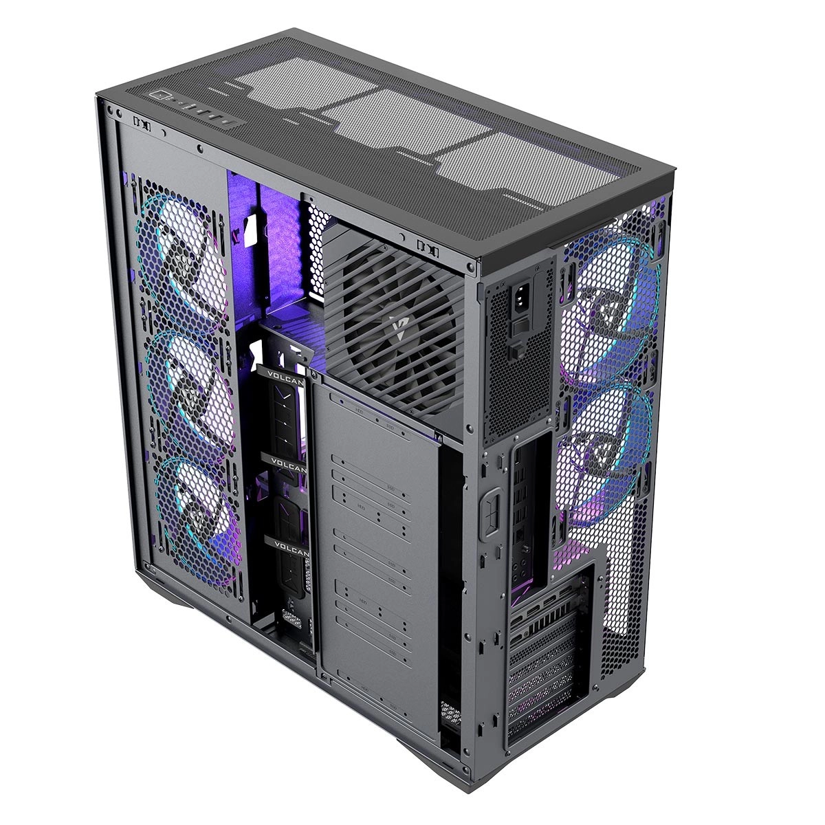 Het interieur is klaar voor E‑ATX-moederborden, lange grafische kaarten en uitgebreide vloeistofkoeling met radiatoren tot 420 mm. Geoptimaliseerde airflow wordt verzorgd door vijf voorgeïnstalleerde 140mm ARGB-ventilatoren (3× zijkant in reversed-configuratie, 2× achter), die stabiele temperaturen waarborgen, zelfs tijdens lange gamingsessies.
