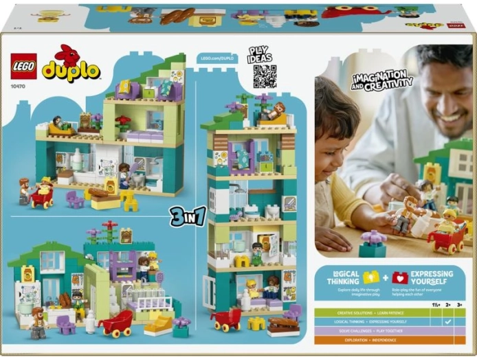 Ontdek de veelzijdige bouwset LEGO DUPLO moderne gezinswoning 3-in-1 met 166 onderdelen voor kinderen vanaf 2 jaar. Kinderen kunnen 3 verschillende huismodellen bouwen – een appartement met één verdieping, een huis met drie verdiepingen of een huisje met vijf verdiepingen en een daktuin. Inclusief 4 familiefiguren en tal van accessoires (kinderwagen, koelkast, toilet enz.) die creatief spel, de ontwikkeling van de fijne motoriek en sociale vaardigheden stimuleren.