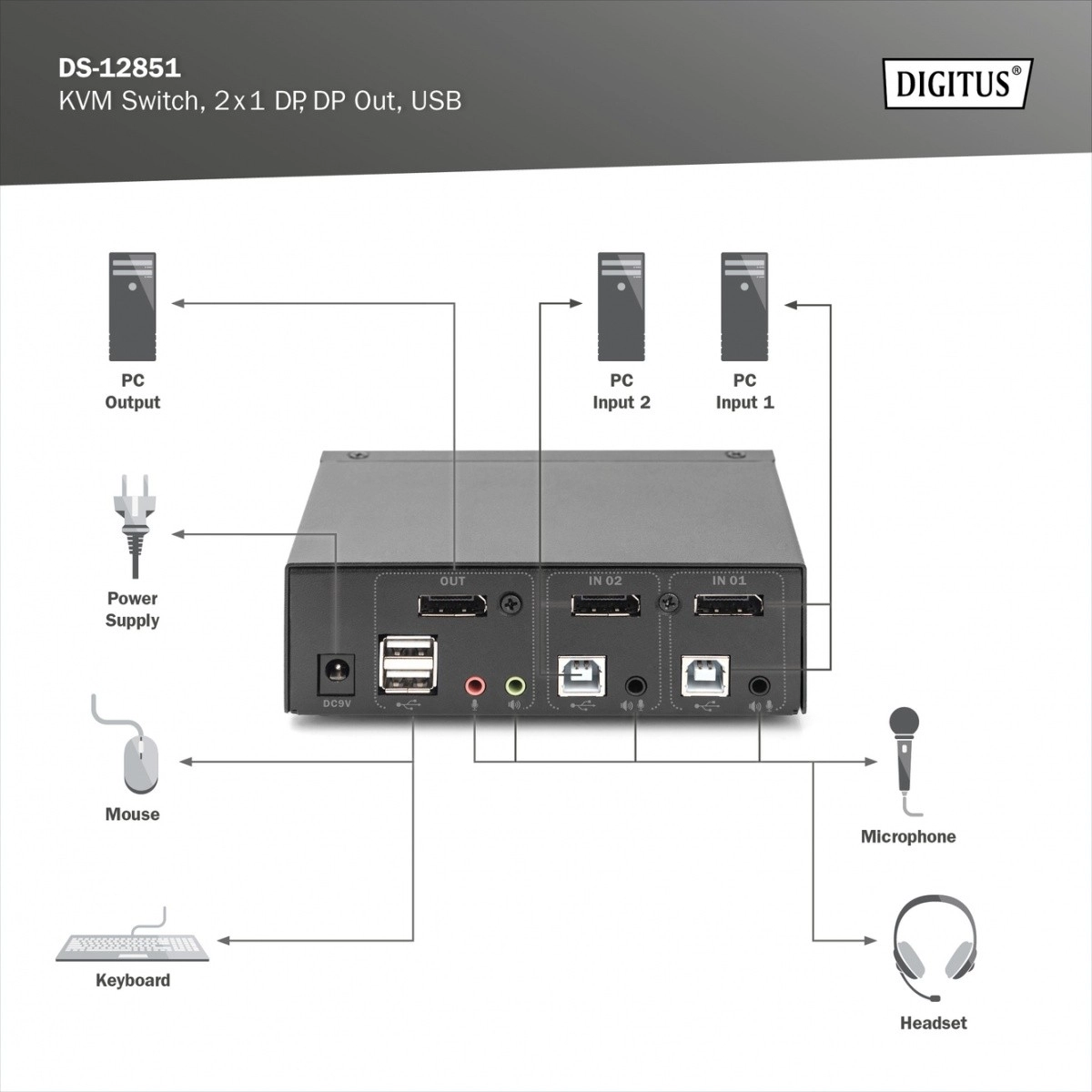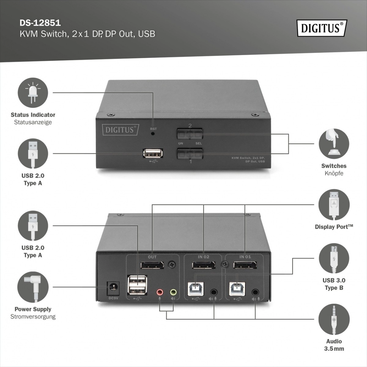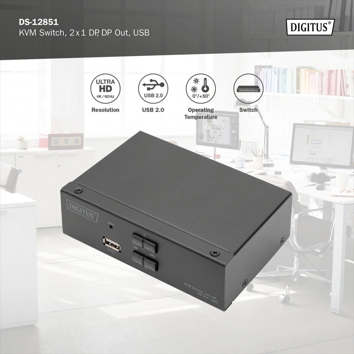 De KVM-switch DS-12851 is een betrouwbare oplossing voor gebruikers die twee computers met één set randapparatuur willen bedienen. Levert haarscherp beeld in 4K@60 Hz, soepel schakelen tussen systemen en eenvoudige installatie ongeacht het platform. De voorste USB-poort biedt snelle toegang tot vaak gebruikte apparaten zoals toetsenbord, muis, usb-stick of printer.