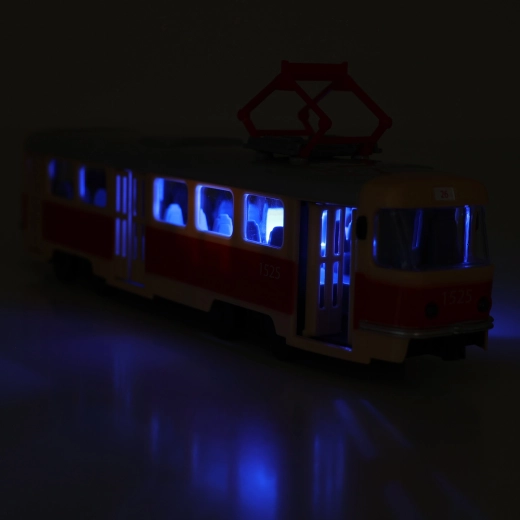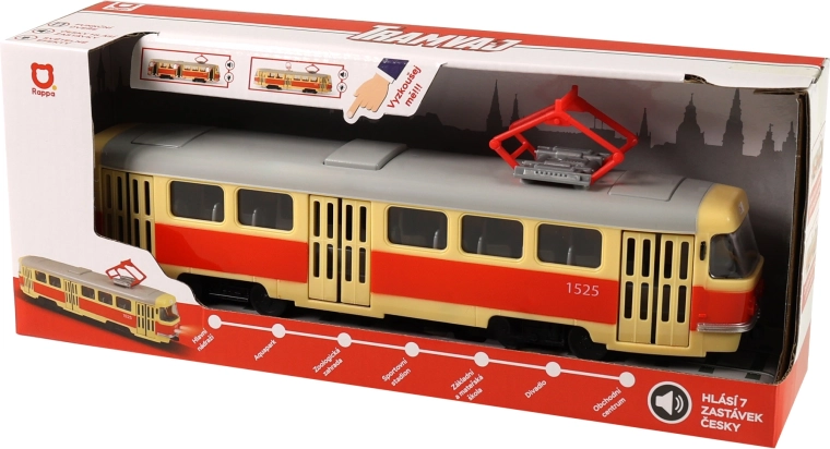 Rood-witte tram die haltes in het Tsjechisch omroept, zodat alle passagiers weten wanneer ze moeten uitstappen. De tram roept 7 haltes om: Hoofdstation, Aquapark, Dierentuin, Sportstadion, Basis- en Kleuterschool, Theater, Winkelcentrum. De deuren worden handmatig geopend en als leuke, geslaagde extra licht het interieur blauw op zodra ze open zijn. Elke keer dat de deuren opengaan, klinkt een omroep en bij het sluiten knipperen zelfs de koplampen. Ruime tram van kunststof met freewheel-aandrijving. Instappen maar, de rit vol plezier begint!
