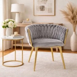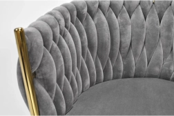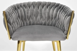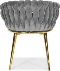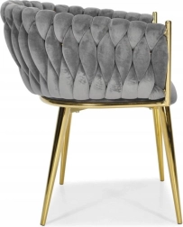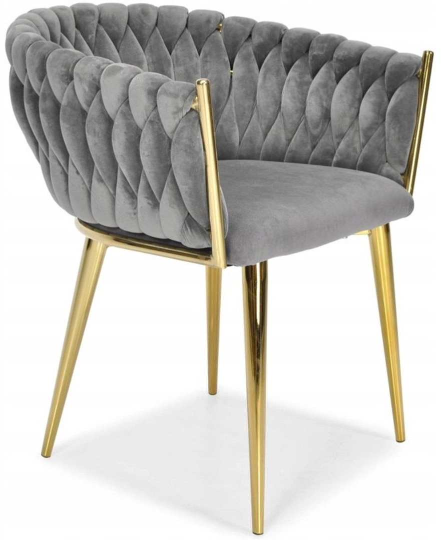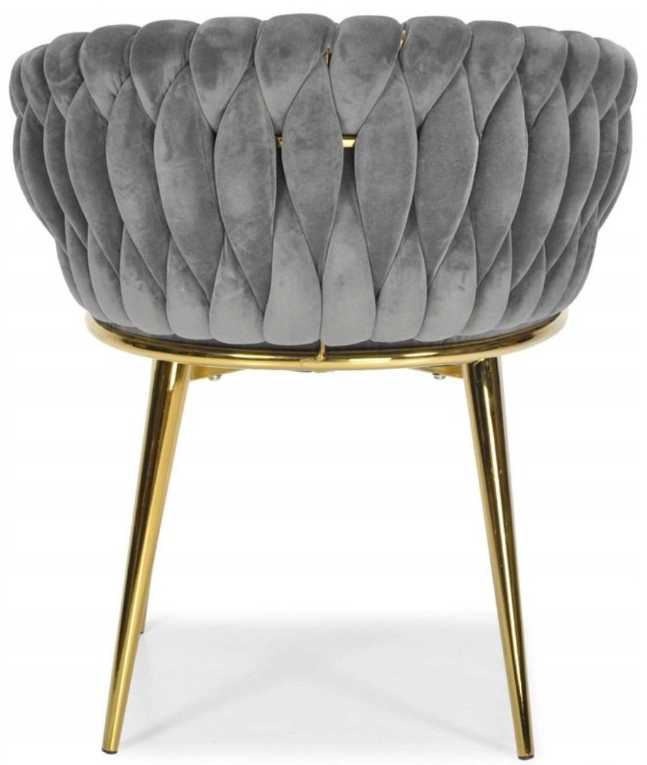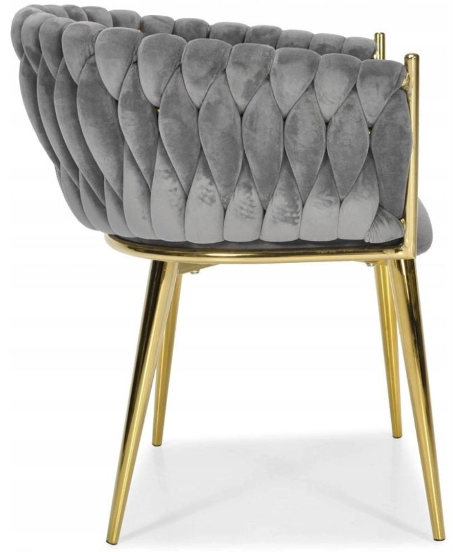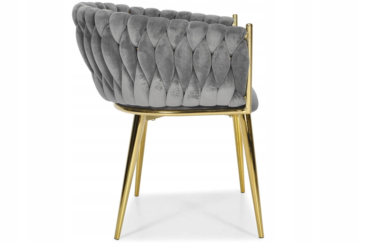Elegante stoel voor eetkamer of woonkamer in tijdloos grijs, combineert fluwelen bekleding, gouden metalen poten en een opvallende 3D-gevlochten rugleuning. De ergonomische vorm met armleuningen zorgt voor comfort, zelfs bij langer zitten, terwijl het stabiele metalen frame duurzaamheid en een lange levensduur biedt.