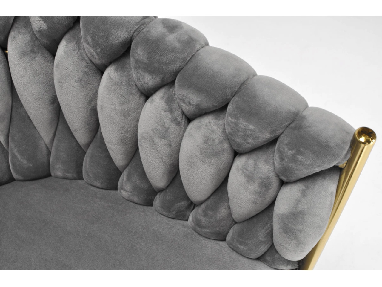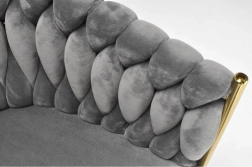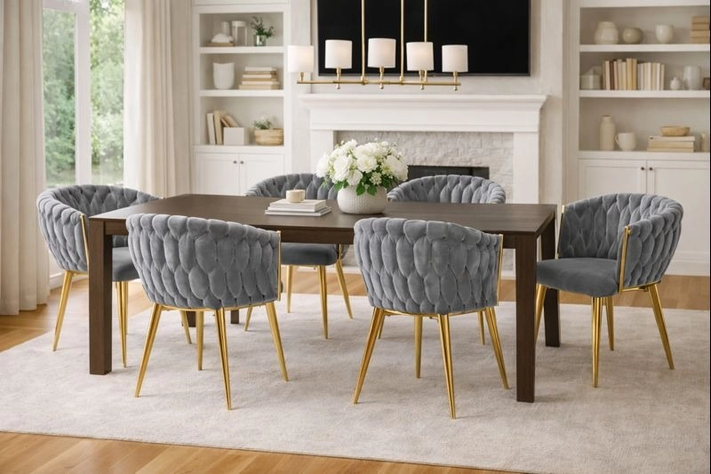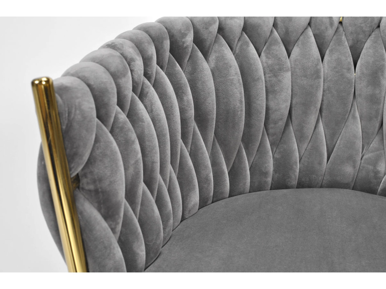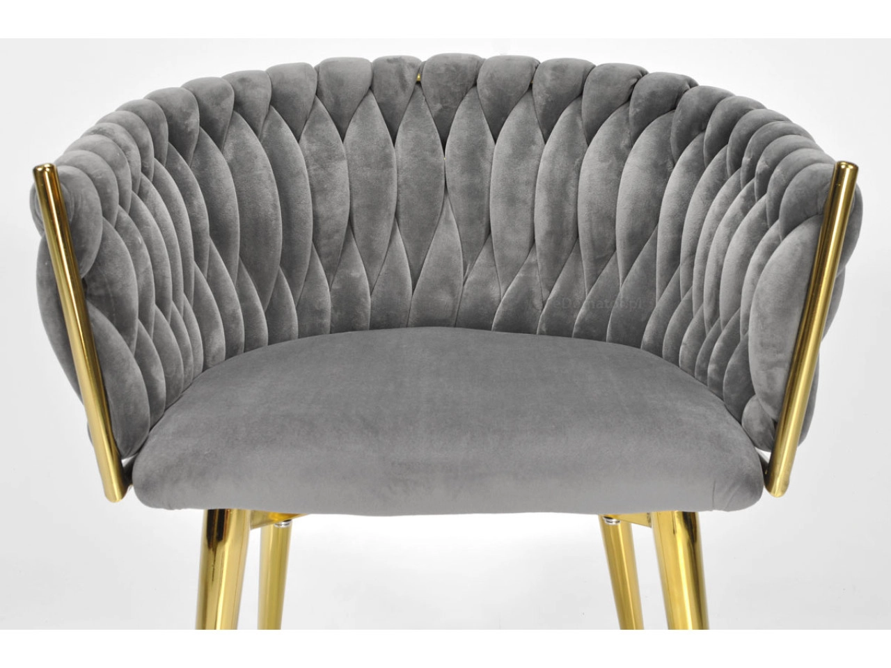 Elegante stoel voor eetkamer of woonkamer in tijdloos grijs, combineert fluwelen bekleding, gouden metalen poten en een opvallende 3D-gevlochten rugleuning. De ergonomische vorm met armleuningen zorgt voor comfort, zelfs bij langer zitten, terwijl het stabiele metalen frame duurzaamheid en een lange levensduur biedt.