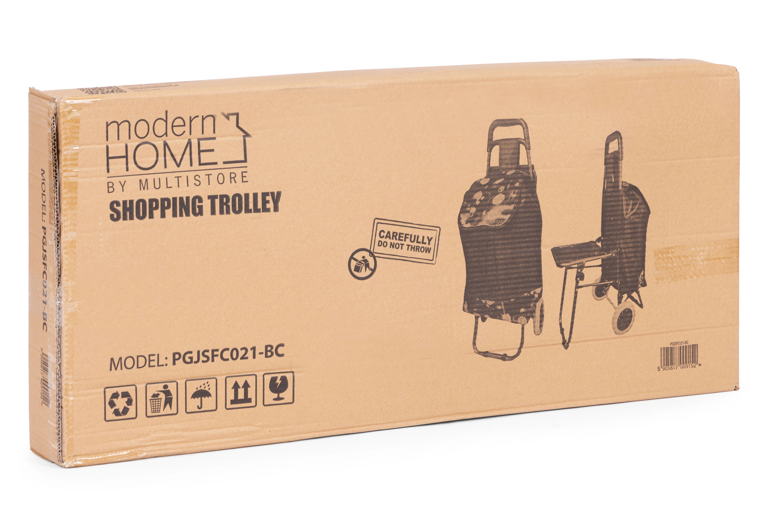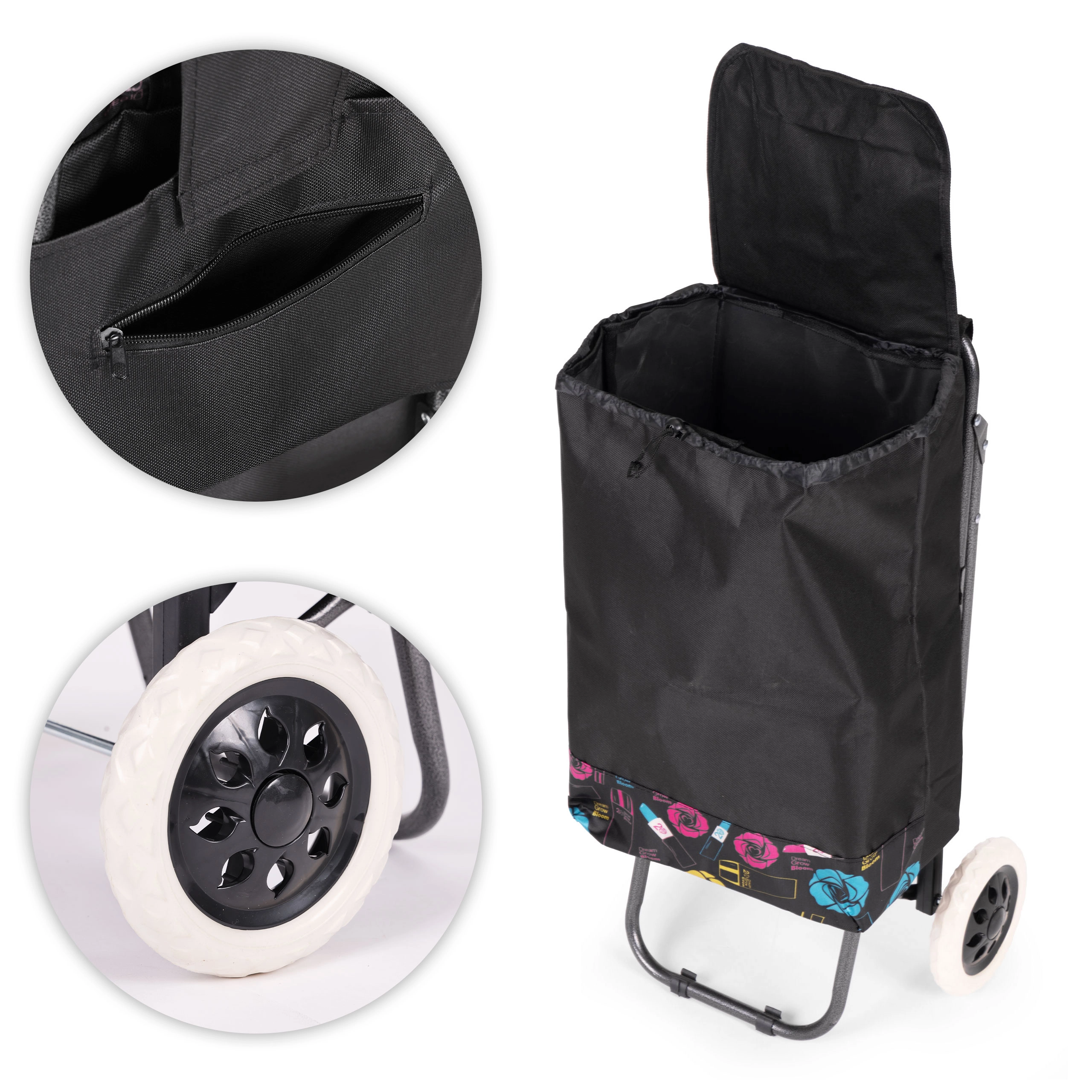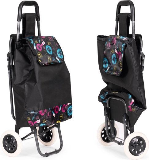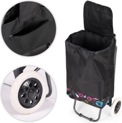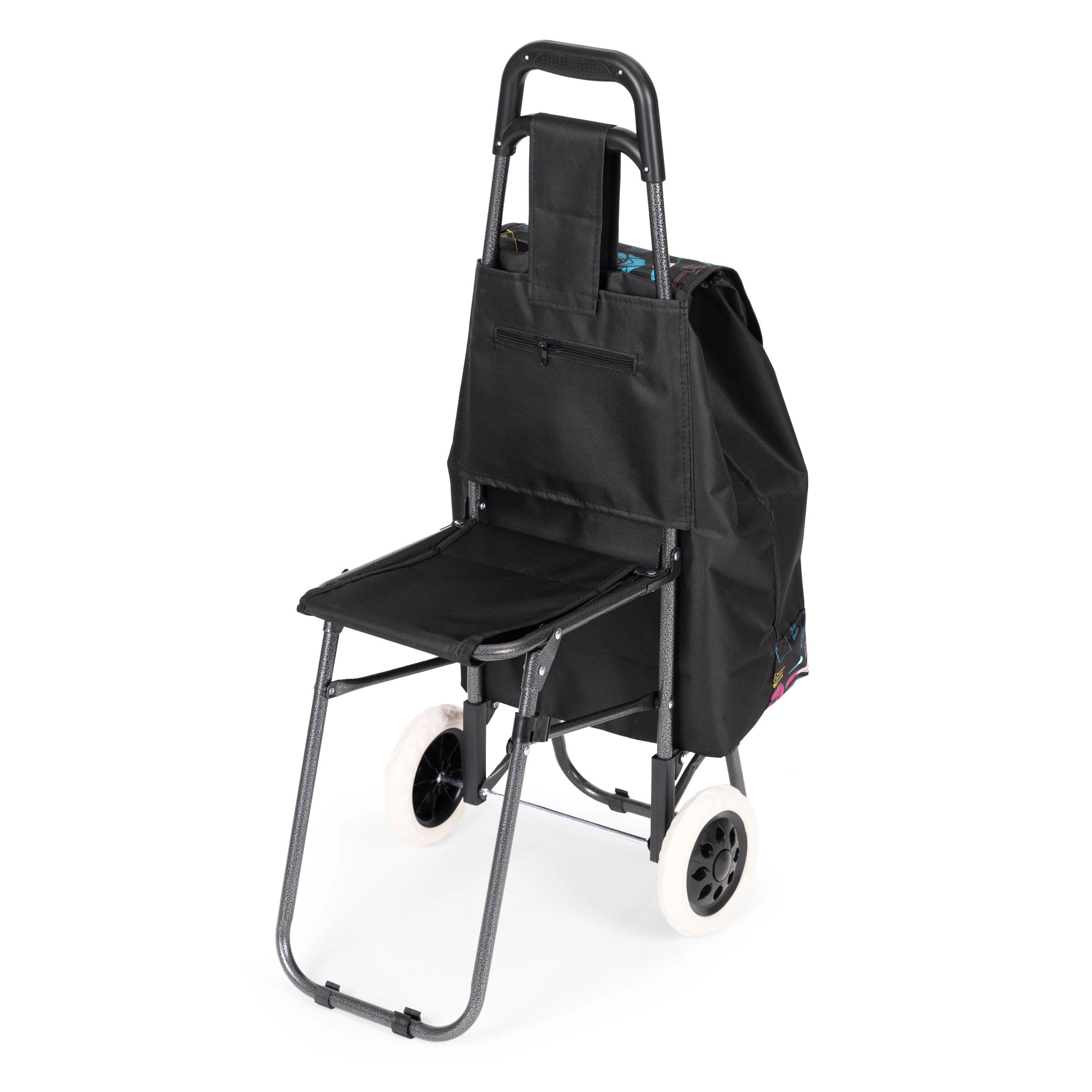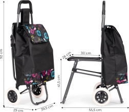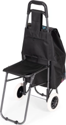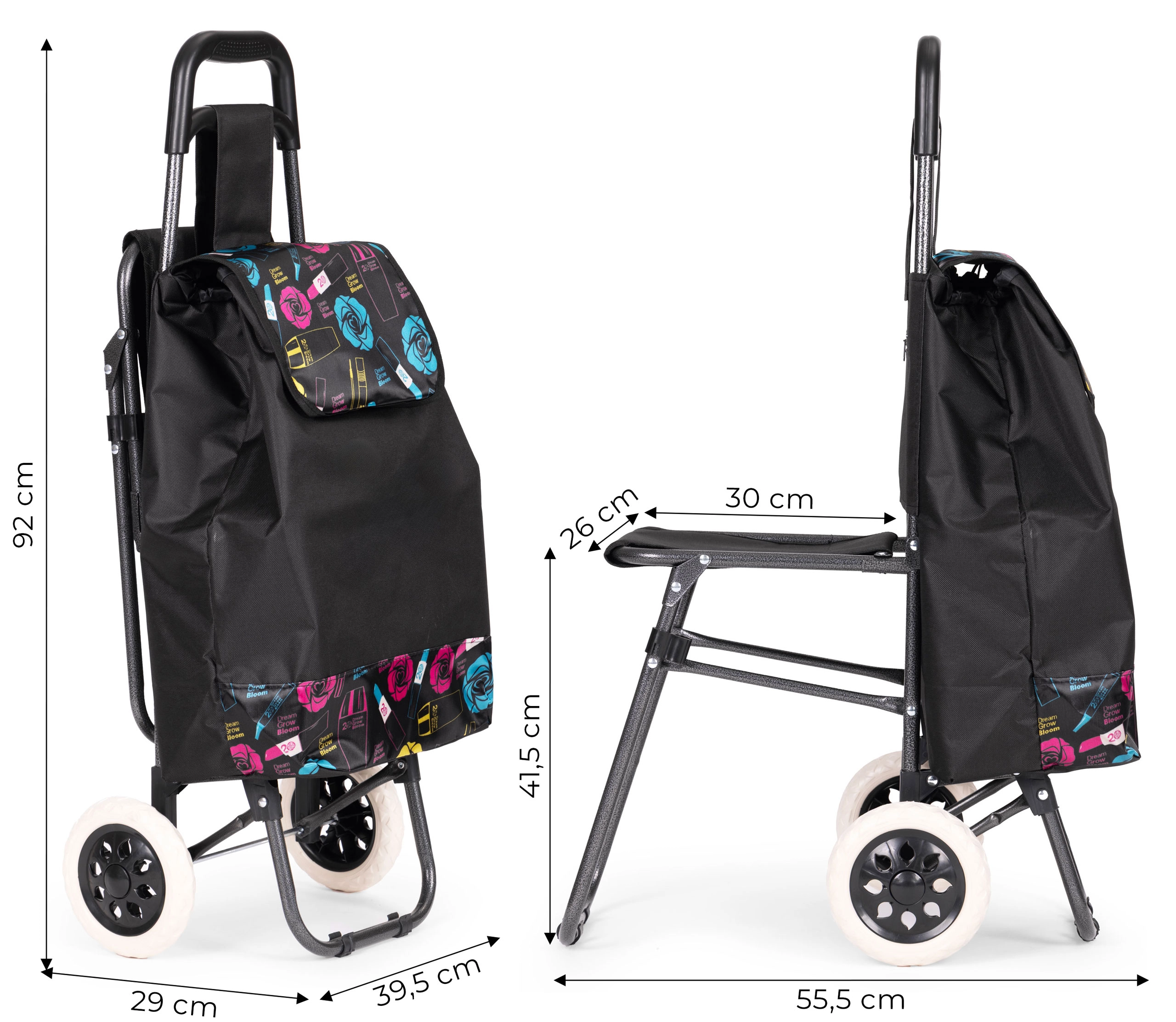 De geïntegreerde opklapbare zitting laat u op elk moment uitrusten – ideaal tijdens het wachten, op de markt of tijdens een wandeling. Het praktische achtervak met rits houdt portemonnee, sleutels of telefoon veilig en binnen handbereik. De versterkte bodem en het draagvermogen van 20 kg zorgen voor stabiliteit, ook bij volle belading.