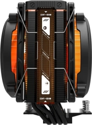 Koperen 6 mm heatpipes in direct contact met de CPU en dichte aluminiumvinnen voeren warmte efficiënt af. De koeler ondersteunt TDP’s tot 230 W.