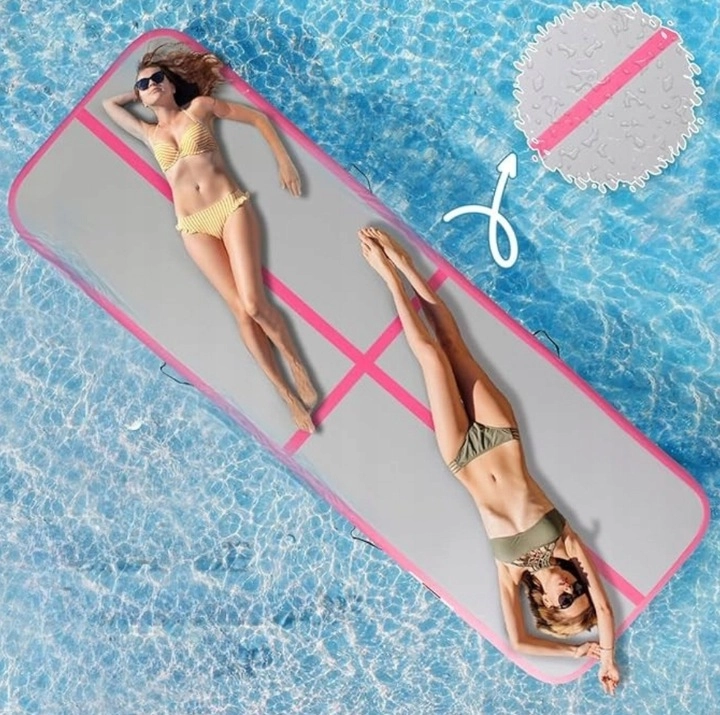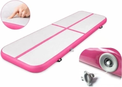 De opblaasbare airtrack-mat is ideaal voor gymnastiek, acrobatiek, cheer, yoga en revalidatie. Dankzij de dikte van 10 cm absorbeert ze schokken en beschermt ze de gewrichten, terwijl de stevige PVC/nylon-constructie lange levensduur en veilig gebruik garandeert. De mat is waterbestendig en blijft drijven, dus ook geschikt bij het zwembad.