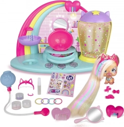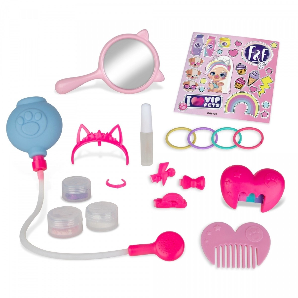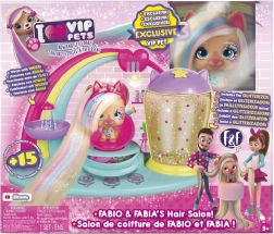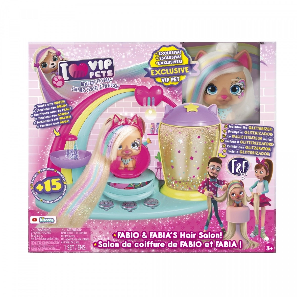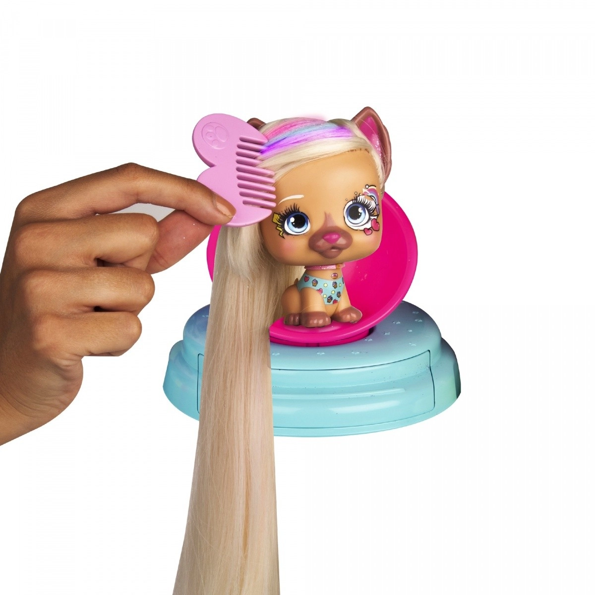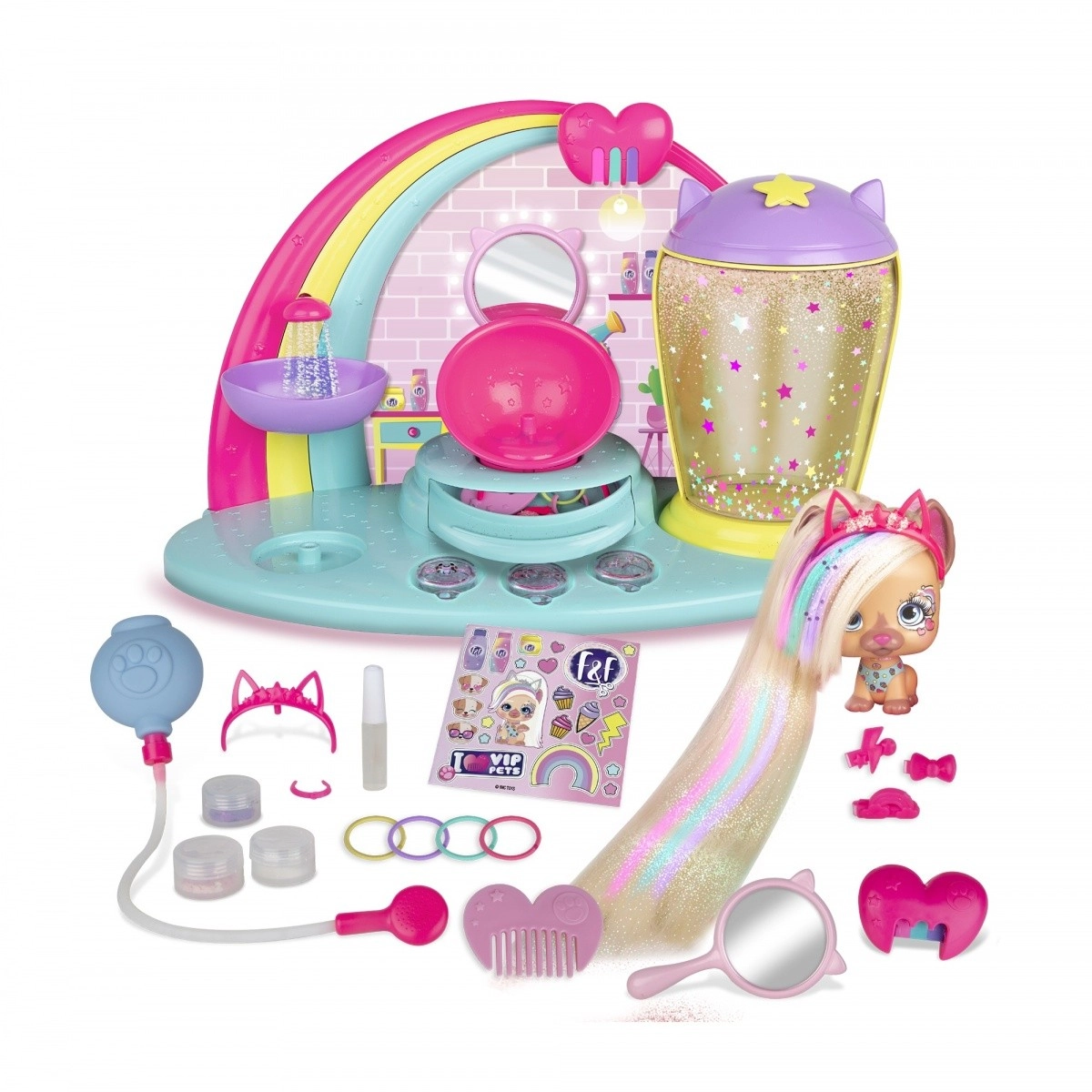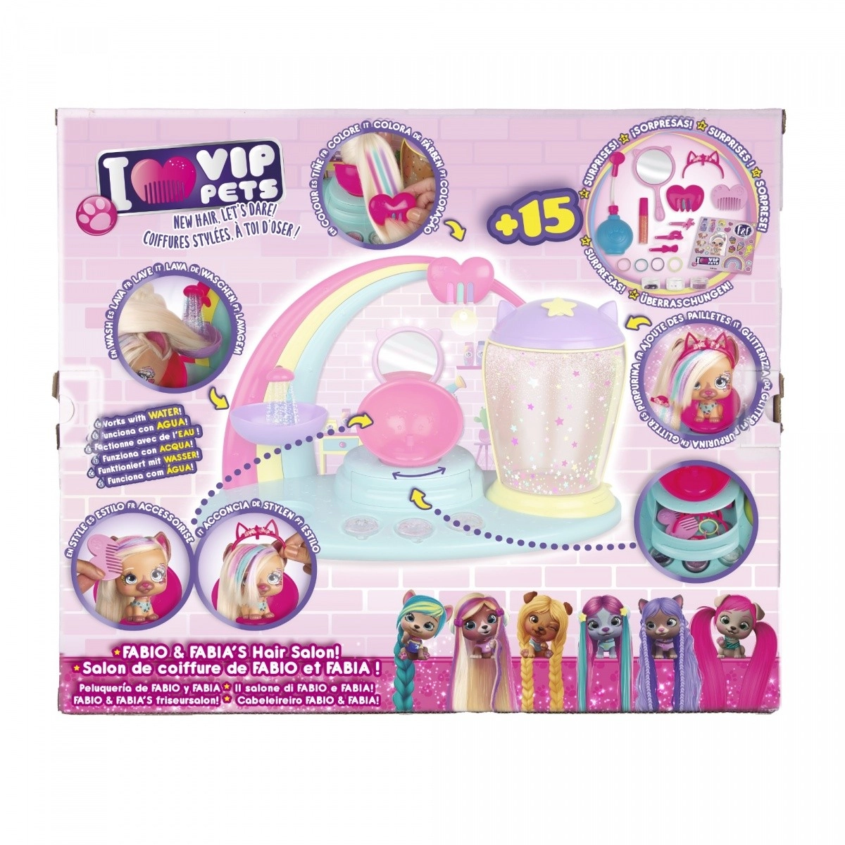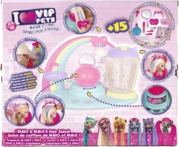 De VIP Pets salon brengt de sfeer van de populaire serie rechtstreeks naar de kinderkamer. De hoofdrol is voor hondje Kiara met platinablond, 30 cm lang haar, dat je kunt wassen, kleuren, kammen, vlechten en versieren. Dankzij de functionele kapperswasbak maak je het haar gemakkelijk vochtig en met de regenboogkam tover je kleurrijke lokken. In de glittercapsule geef je het kapsel een betoverend glinstereffect.