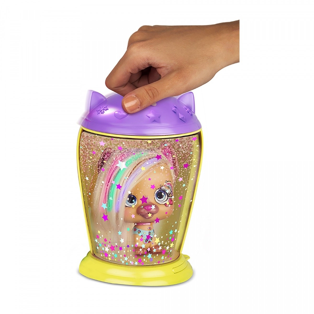 Plaats de figuur in de kamer, activeer het deksel en kijk hoe het haar oplicht met sterretjes en glitters.