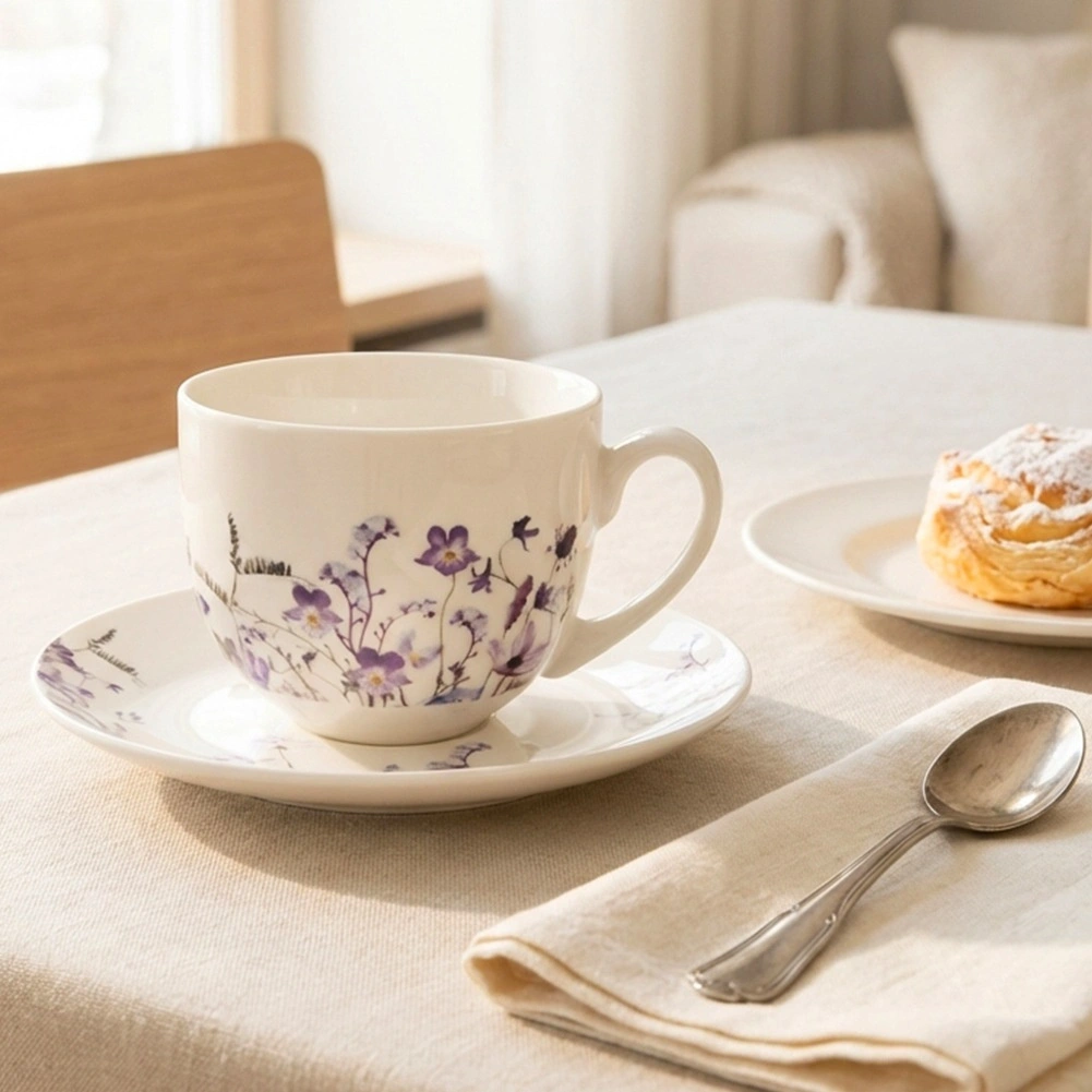De praktische vorm met een ergonomisch oor zorgt voor comfortabel drinken, terwijl de schotel een stabiele en elegante basis vormt. Hoogwaardig porselein is bestand tegen dagelijks gebruik en maakt eenvoudig onderhoud in de vaatwasser en snel opwarmen in de magnetron mogelijk.