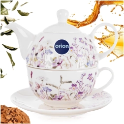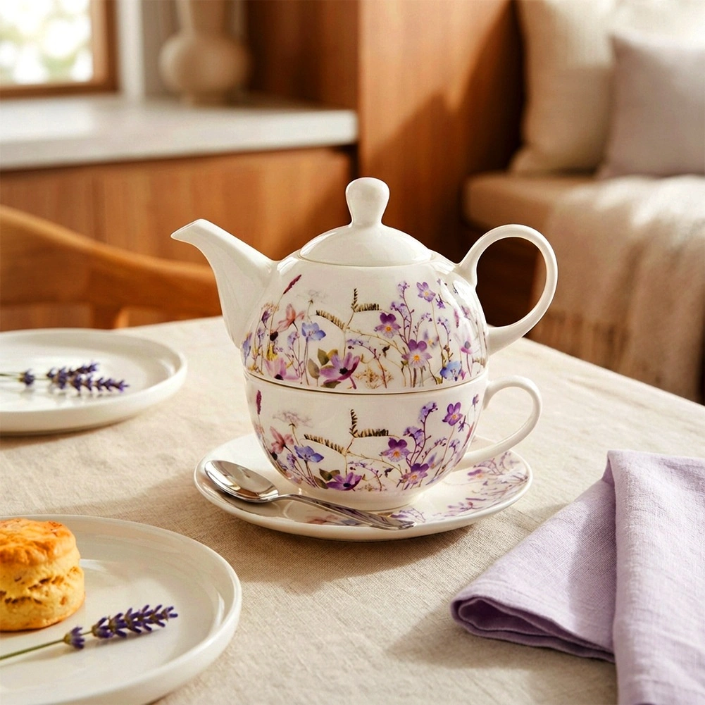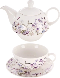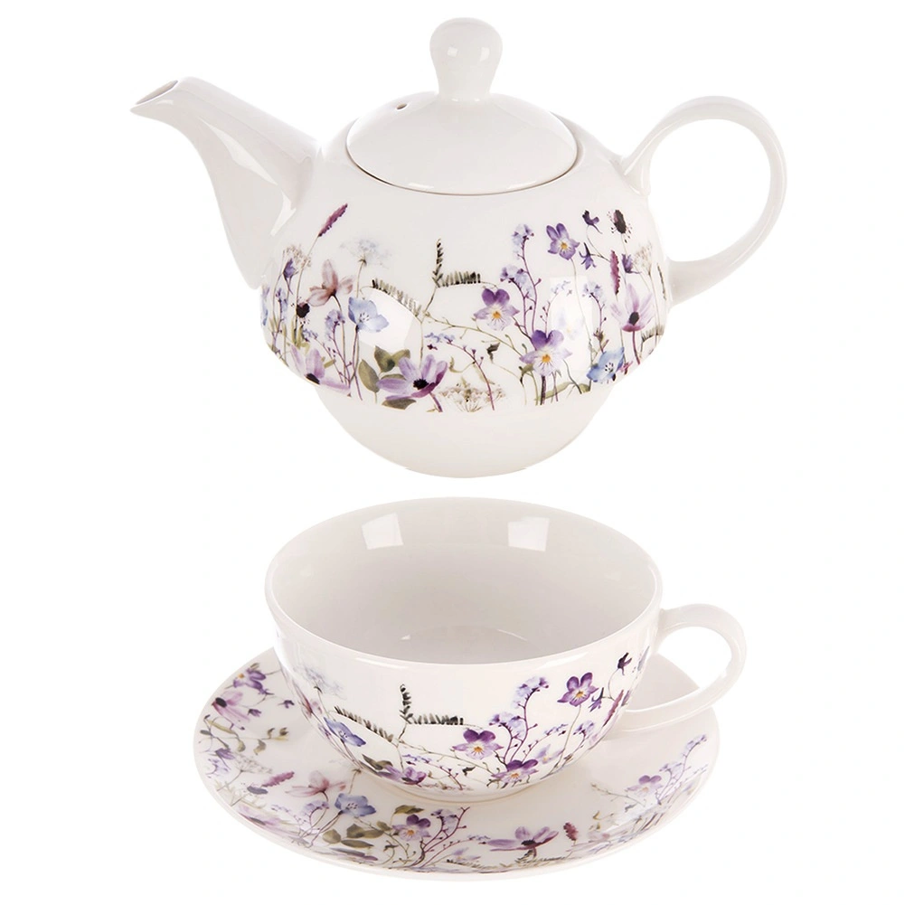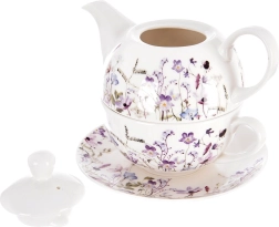 Deze porseleinen theeset voor één persoon is ontworpen voor maximaal comfort en stijl. De theepot kan direct op de kop worden geplaatst, wat ruimte bespaart en een harmonieus geheel vormt. De subtiele decoratie van weidebloemen in paarse en roze tinten geeft de tafel een romantisch tintje en laat zich gemakkelijk combineren met ander servies.